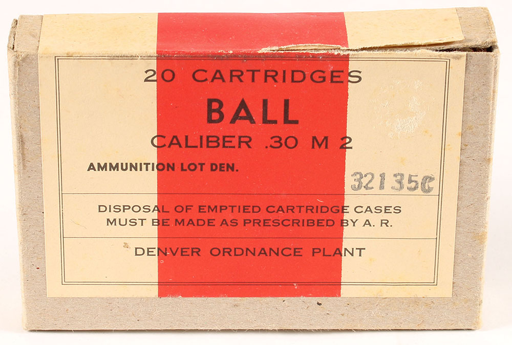 Denver Ordnance, Ball, ,30 M2 (.30-06), Lot Den. 32135C, FULL & SEALED, 1pc. Buff box with red & white label, box is solid with very good color, some age soiling, partial seam splits to back top & bottom edges, some edge & corner wear, label is intact. Grade: Very Good + - Value: 24 to 36