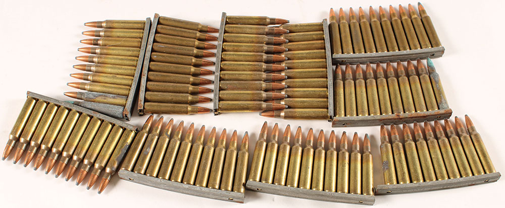 Large lot of 5.56mm handloads on clips, all soft points, being sold for compontes as these are handloads, fire at your own risk, ammo ranges from very good to good. Grade: Very Good + - Value: 20 to 60