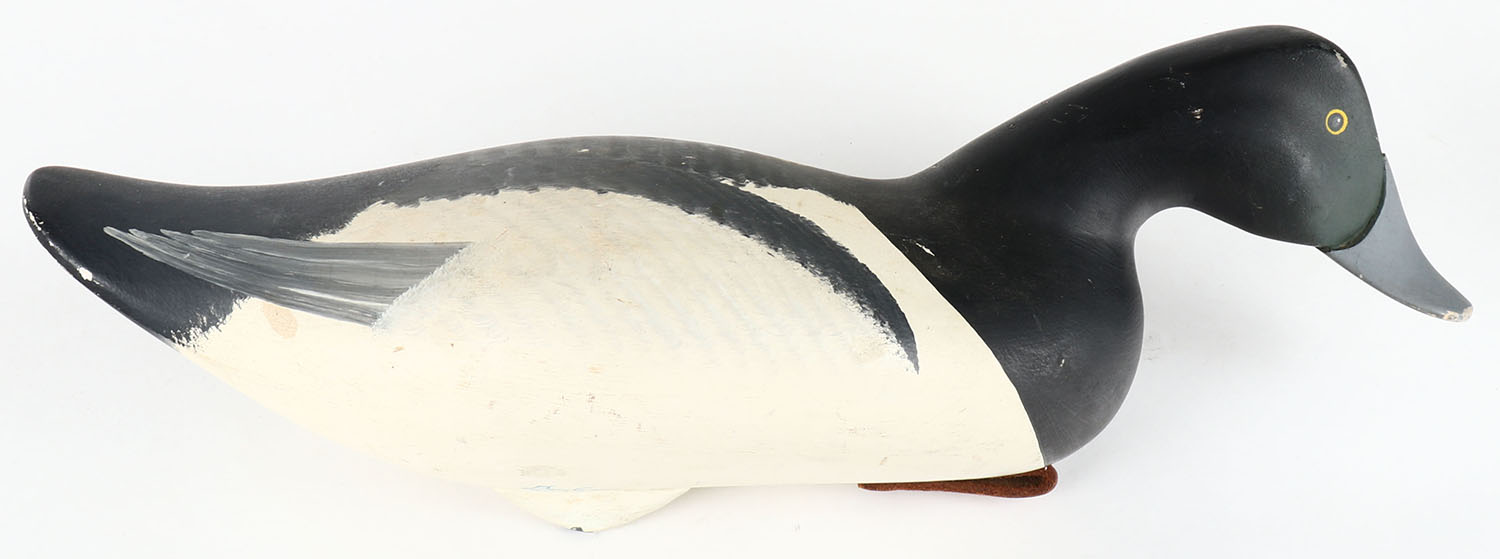 Swimming Bluebill Drake by Dan Carson, Haver de Grace, MD, c1990, PE, solid wood, original paint, structurally excellent, signed on bottom, 16 1/2'' OAL. Grade: Excellent - Value: 100 to 300