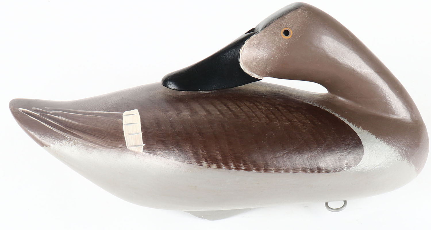 Preening Canvasback Hen by David Walker, MD, painted eyes, solid wood, original paint, structurally excellent, branded on bottom ''WALKER'', 13''. Grade: Excellent - Value: 30 to 60