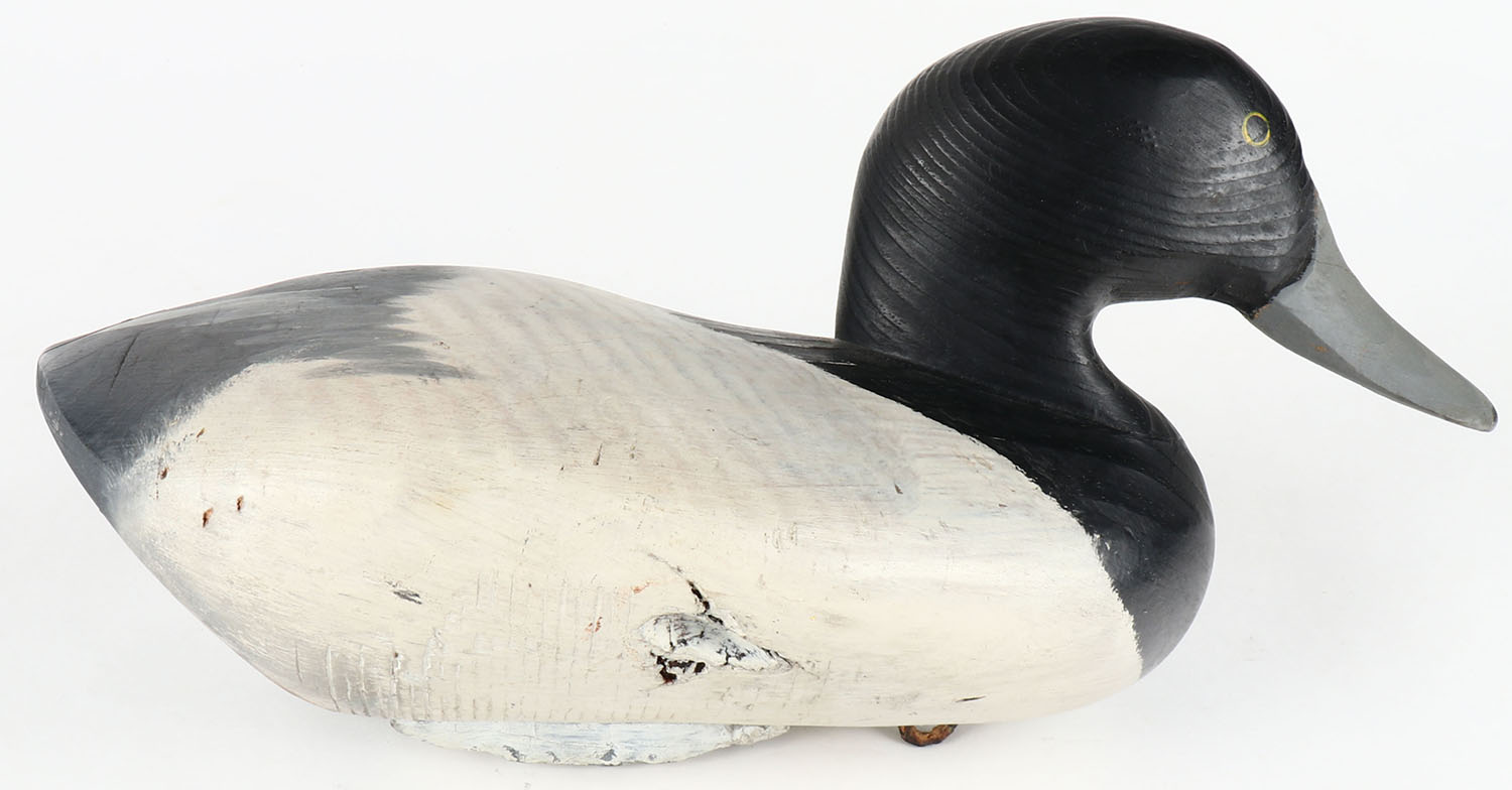 Bluebill Drake by Ben DiMauio, from MD, painted eyes, solid wood, original paint, structurally excellent, signed on bottom, 13 1/26'' OAL. Grade: Excellent + - Value: 30 to 60