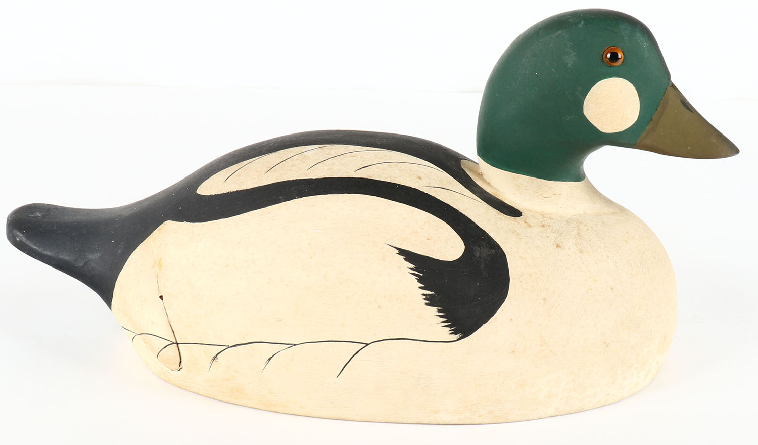 Goldeneye Drake by Glen Burnie, Stoney Point Decoys, MD, glass eyes, solid wood, original paint, structurally excellent, stamped on bottom. Grade: Excellent + - Value: 20 to 40