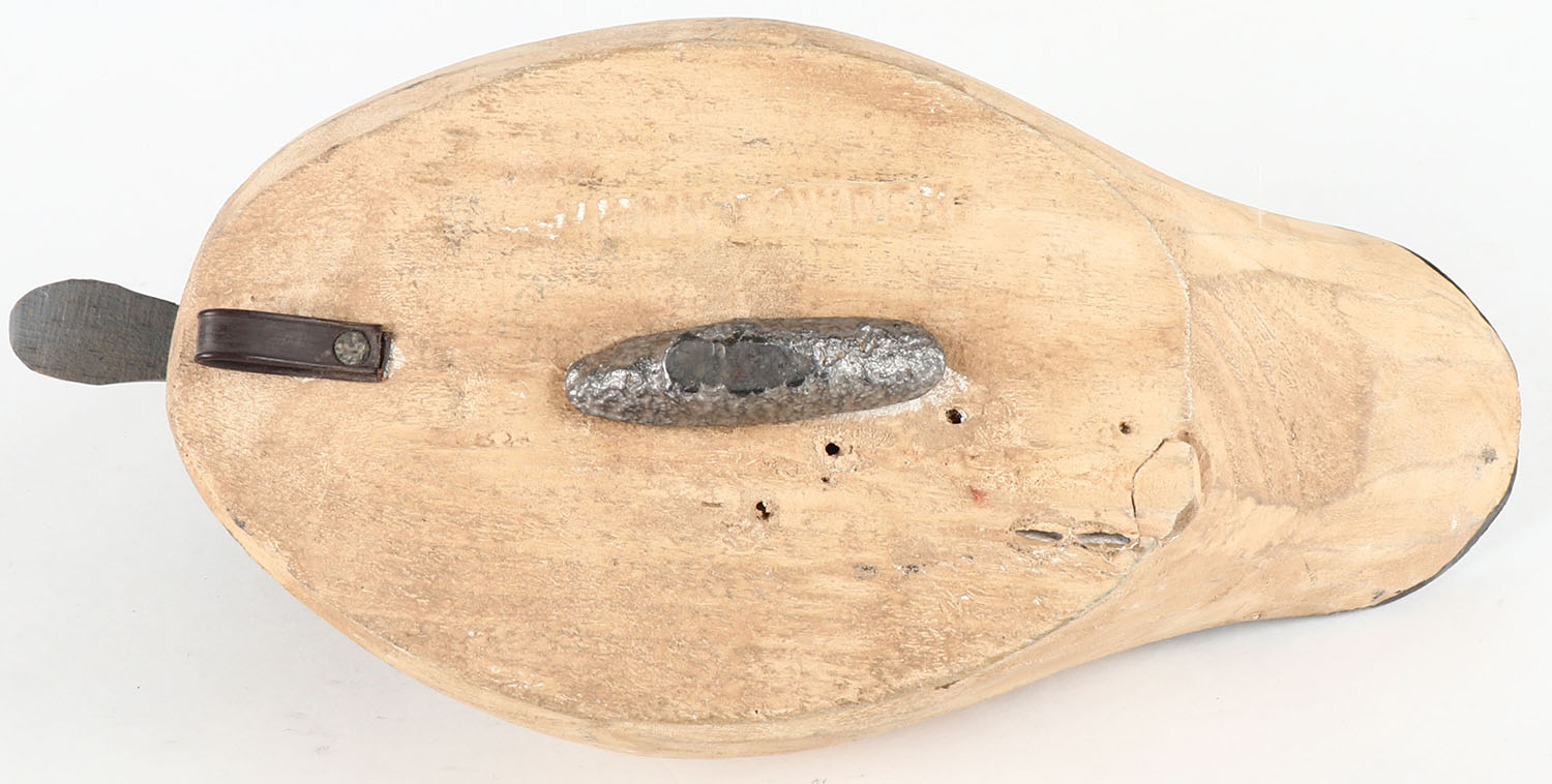 Bufflehead drake by Jimmy Bowden, Chincoteague, VA, glass eyes, solid wood, original paint, structurally excellent, branded on bottom, 12'' OAL. Grade: Excellent + - Value: 50 to 100