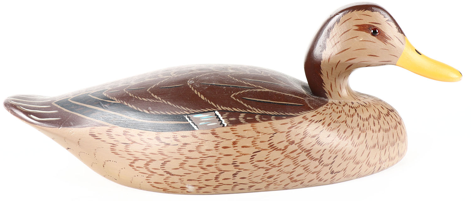 Mallard Hen by Wet Land Decoys Sea Girt, NJ, GE, solid wood, original paint, structurally excellent, signed JT under bill, 15'' OAL. Grade: Excellent + - Value: 20 to 60