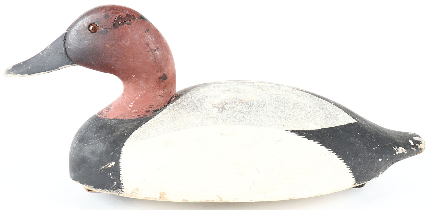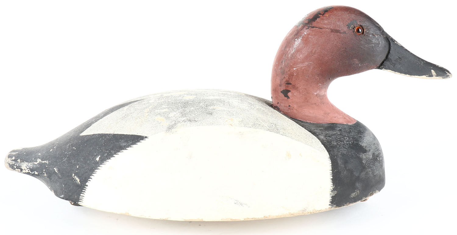 Canvasback Drake by unknown maker, branded WGH, GE, hollow wood with bottom board, original paint, structurally excellent, 15'' OAL. Grade: Very Good + - Value: 40 to 80
