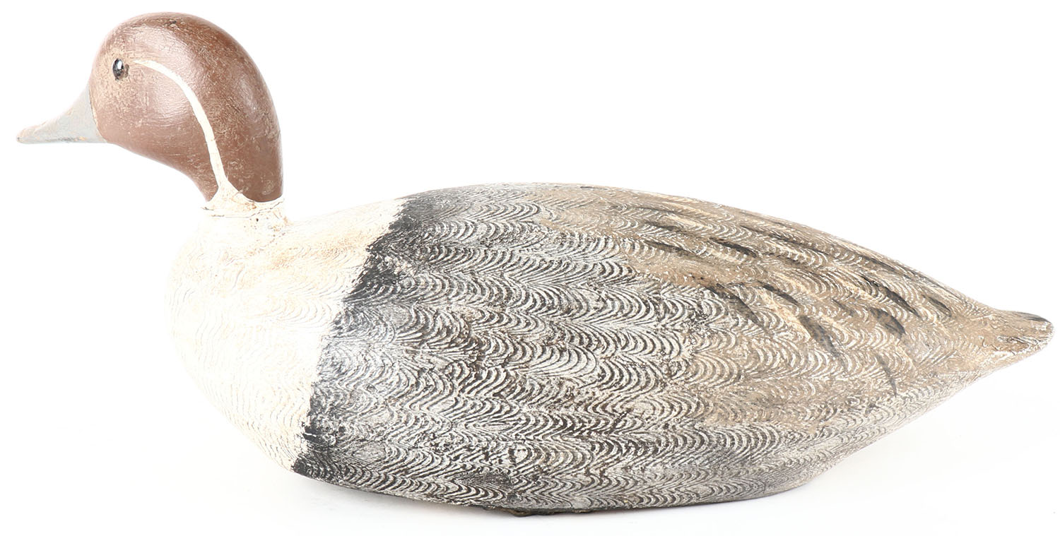 Pintial Drake by unknown maker, GE, hollow wood, original comb paint, structurally excellent, has two leather line ties on long side of bottom, 15'' OAL. Grade: Very Good ++ - Value: 50 to 100