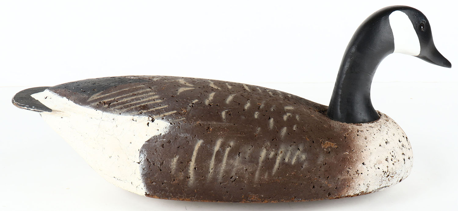 Canada Goose by LL Bean, unmarked on keel, glass eyes, solid cork body, wood head, original paint, structurally excellent, 25'' OAL. Grade: Excellent ++ - Value: 10 to 50