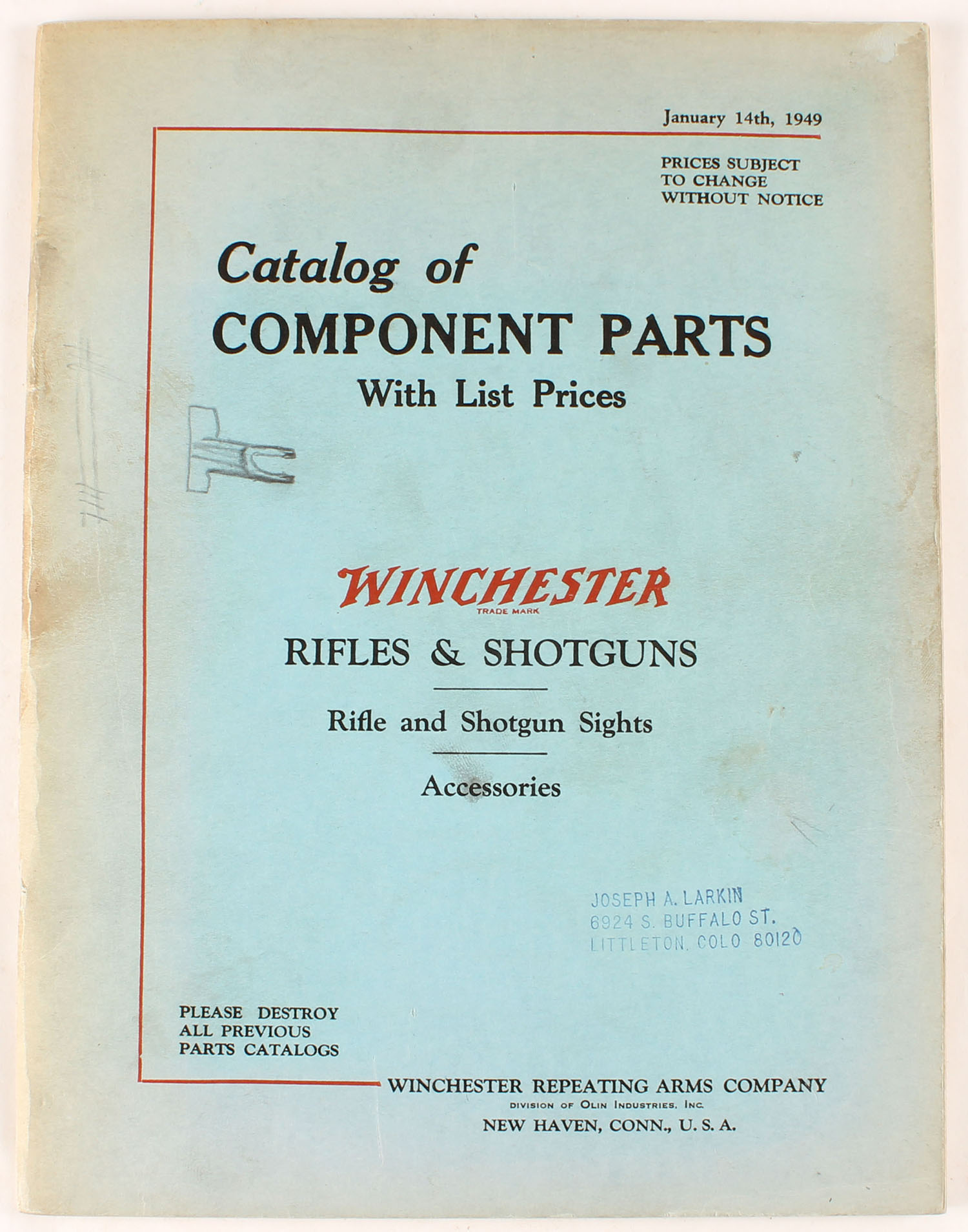 Catalog of Component Parts with List Prices Winchester: Rifles & Shotguns, Rifles & Shotguns Sights, Accessories, January 19th, 1949, 8 1/2'' x 11''. Staplebound. Grade: Very Good + - Value: 2 to 50