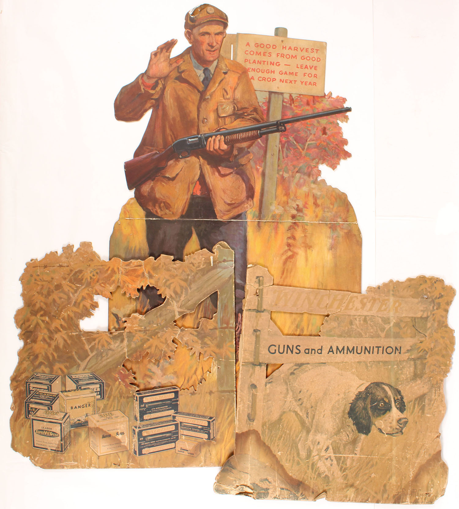 RARE Winchester POP Display, This 3D full fall color hunting scene, pictures upland hunter & his dog with a fence and fall trees & ammo boxes, it is complete but shows lots of fading & age soiling, 42'' side x 41'' tall, the pieces are not connected & would need some help getting them to connect, otherwise a very rare & desirable diecut, has easel back. Grade: Good - Value: 500 to 2000