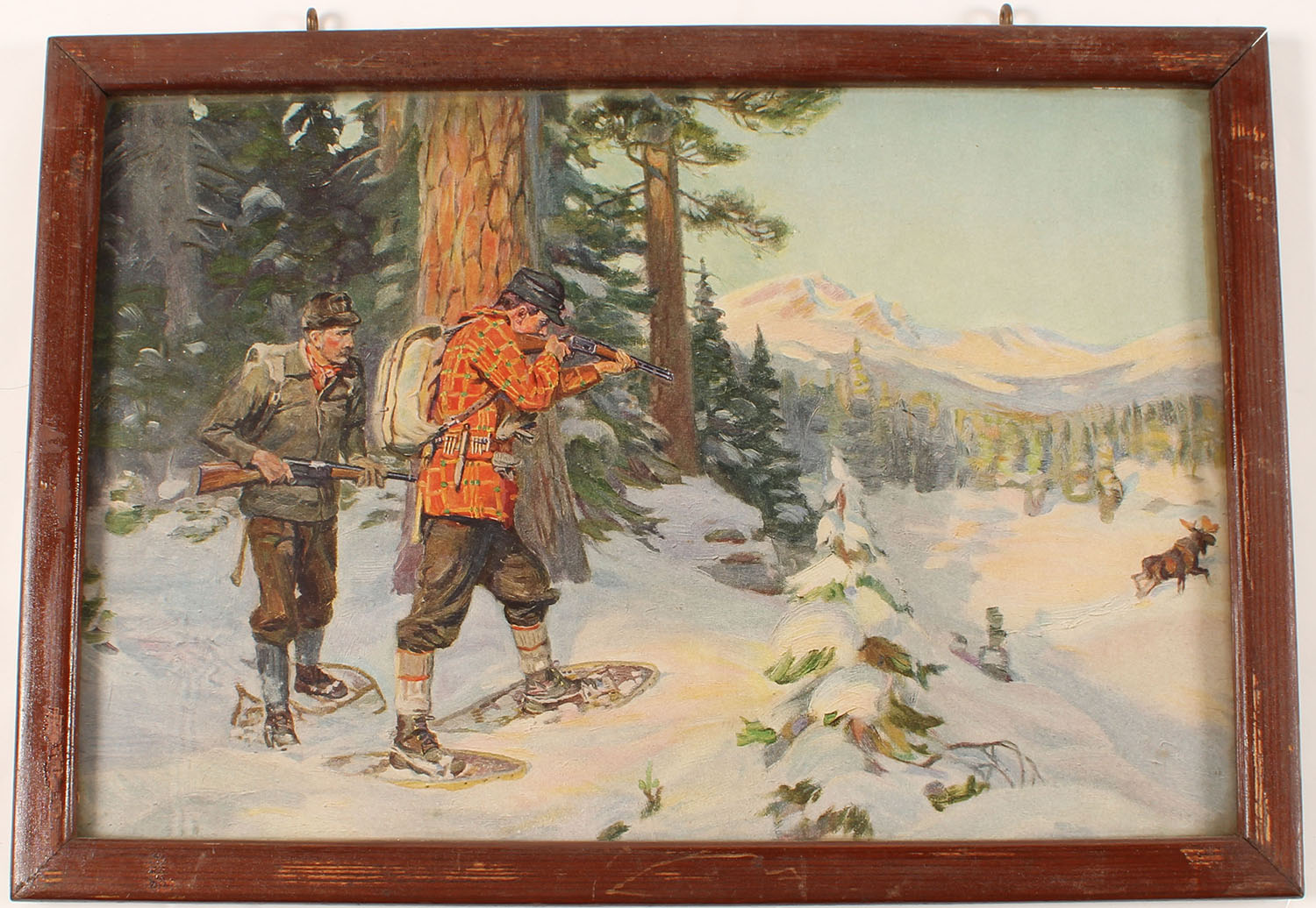 Philip R. Goodwin print, nice full color image of hunters shooting at bull moose in snow scene, image size 13 1/2'' x 9'', framed. Grade: Excellent - Value: 20 to 100