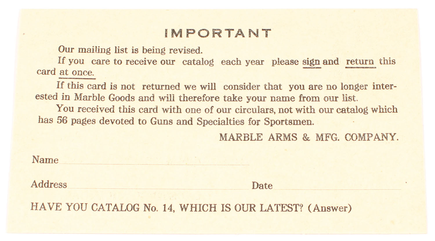 Marbles Arms & Mfg. Co. postcard, unused. Grade: Excellent ++ - Value: 10 to 50
