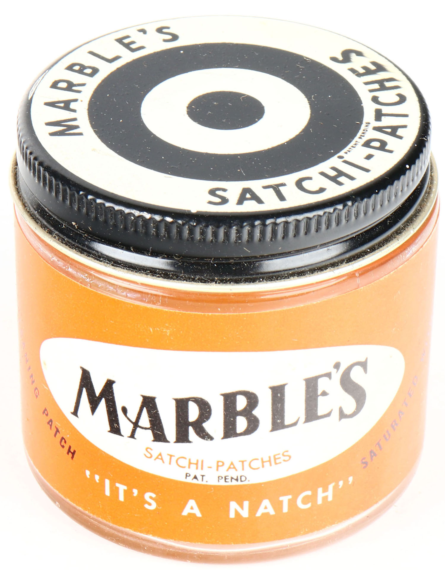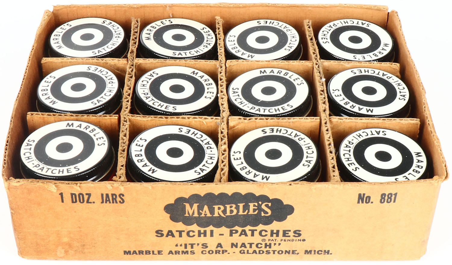 Marbles Satchi-Patches case, 12/12, NO. 881, Cardboard case is solid, inside glass jars are mint, has no top. Grade: Exellent - Value: 40 to 80