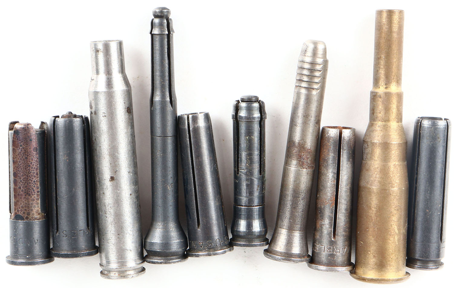 Lot of Marbles & Ideal broken shell extractor and aux carts, AUXILIARY CARTS: (1) No. 153 (.303 Savage - .32 Smith & Wesson), (2) No. 152 (.25-35 Win. - .25 Colt Auto.), (1) No. 164 (.32 Remington - .32 Colt Auto.), (1) No. 151 (.30-30 Win. - .32 Short Colt), (1) .30-06 - .32 Short, SHELL EXTRACTORS: (1) unknown caliber, (1) .257 Roberts, (1) .32-40 Winchester, (1) .35 Self-Loading . Grade: Excellent - Value: 20 to 60