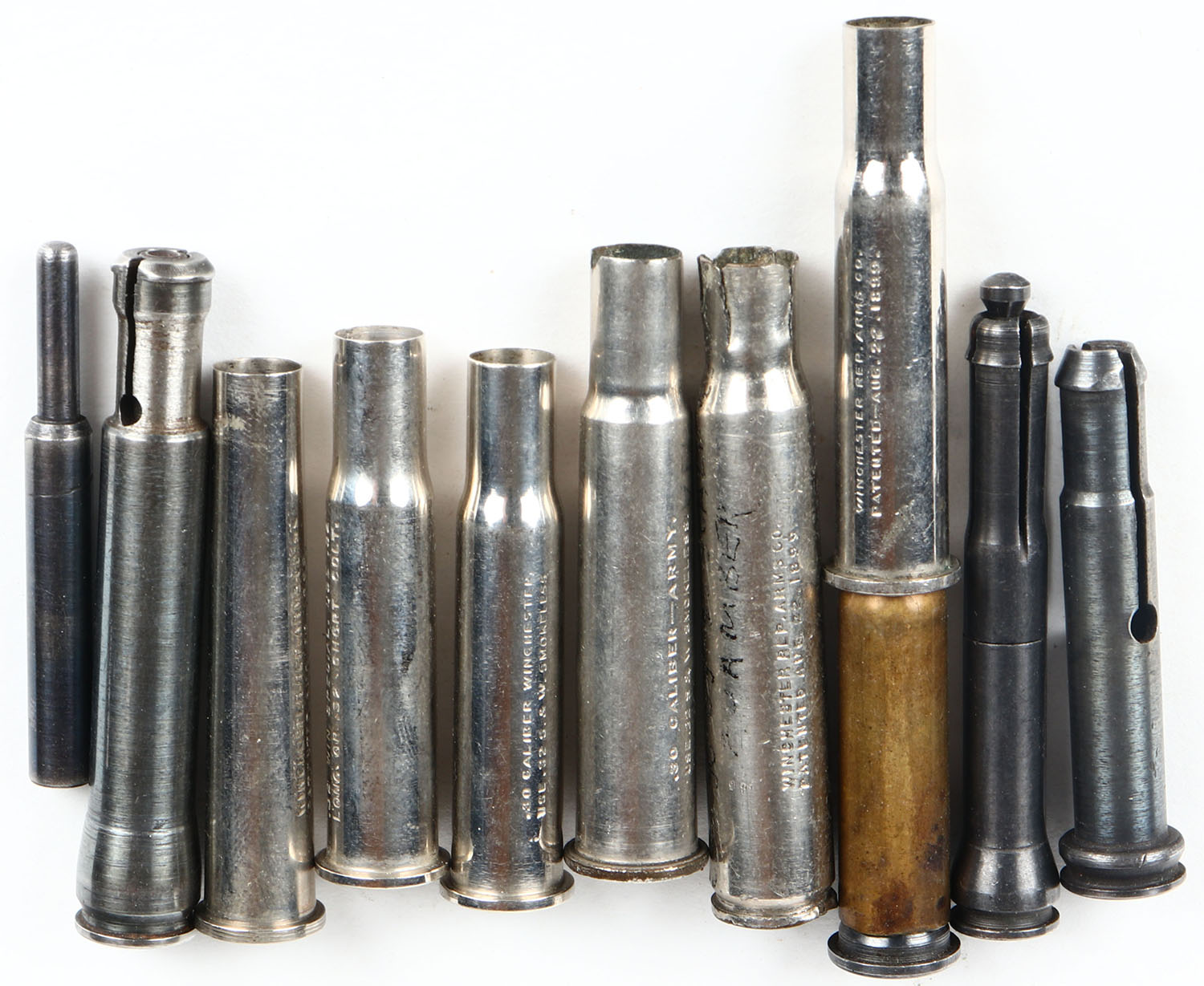 Lot of Winchester auxillary carts and Marbles broken shell extractors, AUXILIARY CARTS: (1) .32 Winchester Special - .32 Long OR Short Colt, (2) .30 Winchester (.30-30) - .32 Smith & Wesson AND .32 Short Colt, (1) .32-40 - .32 Long OR Short Colt, (1) .30-06 - .32 Smith & Wesson (cracked neck), (1) .30 Army - .32 Smith & Wesson (deformed neck), SHELL EXTRACTORS: (1) .35 Whelen, (1) .30 Remington, (1) .300 Savage. Grade: Very Good - Value: 20 to 60