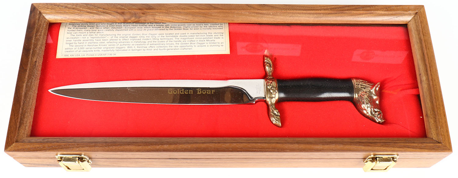 RARE! Large Kershaw Golden Boar knife in original box, 9'' blade, unused. Grade: MINT - Value: 40 to 300
