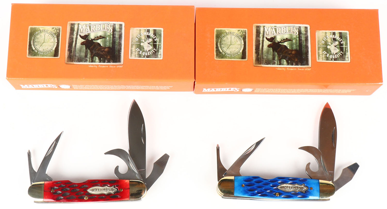 Lot of 2 Marbles folding knives, 3'' longest blade, in boxes. Grade: Excellent ++ - Value: 20 to 80