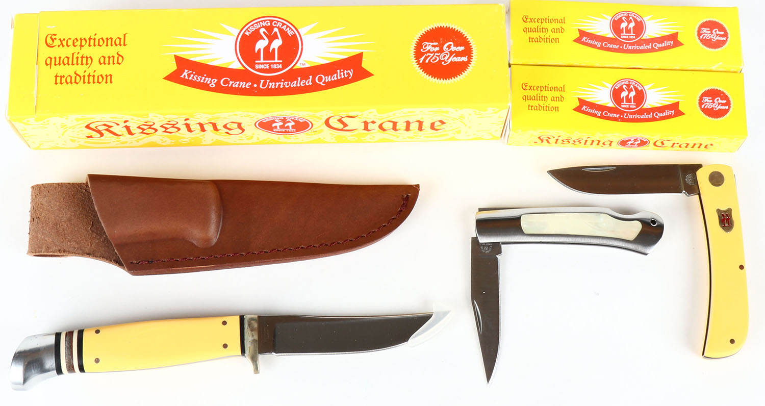 Lot of 3 Kising Crane folding knives, in box. Grade: Excellent ++ - Value: 16 to 50