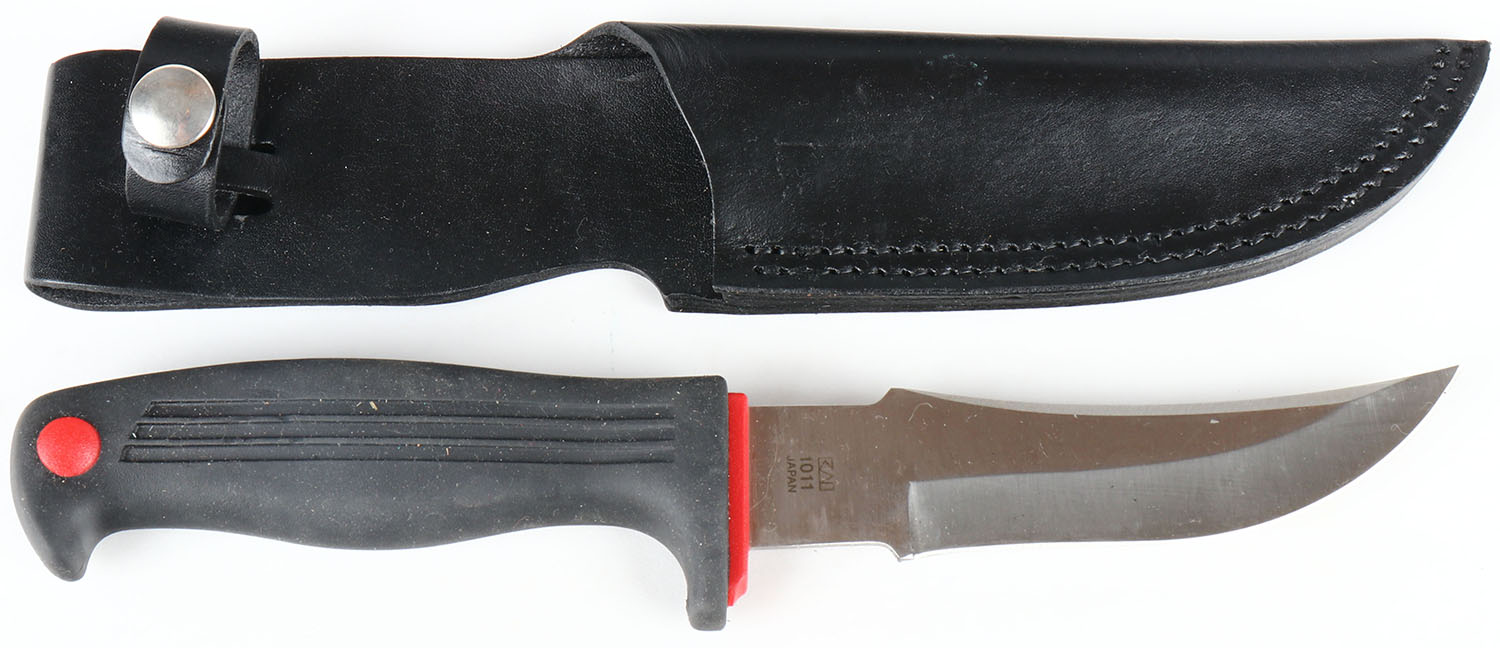 Fixed blade knife, Kershaw knife, has leather sheath, 4 1/2'' blade. Grade: Excellent - Value: 30 to 90