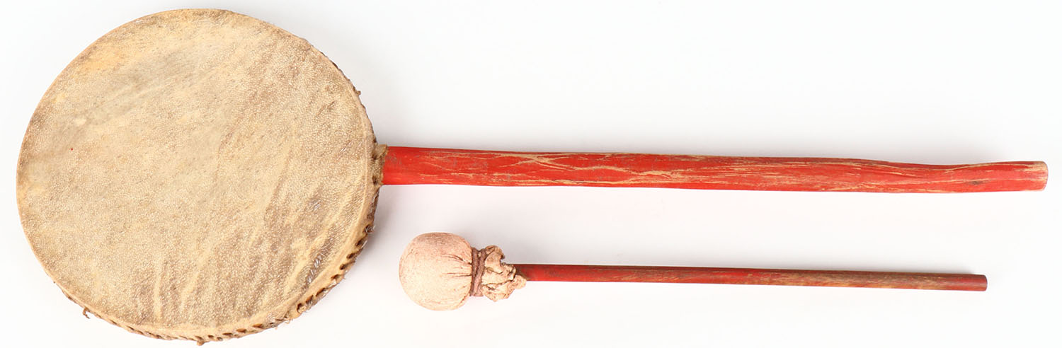 One of a kind Blackfoot Native Ameircan Medicne man held prayer drum with orignal beater, rawhide head nd lcaing with red ocher paint on handle circa 1890. Grade: Excellent - Value: 20 to 500