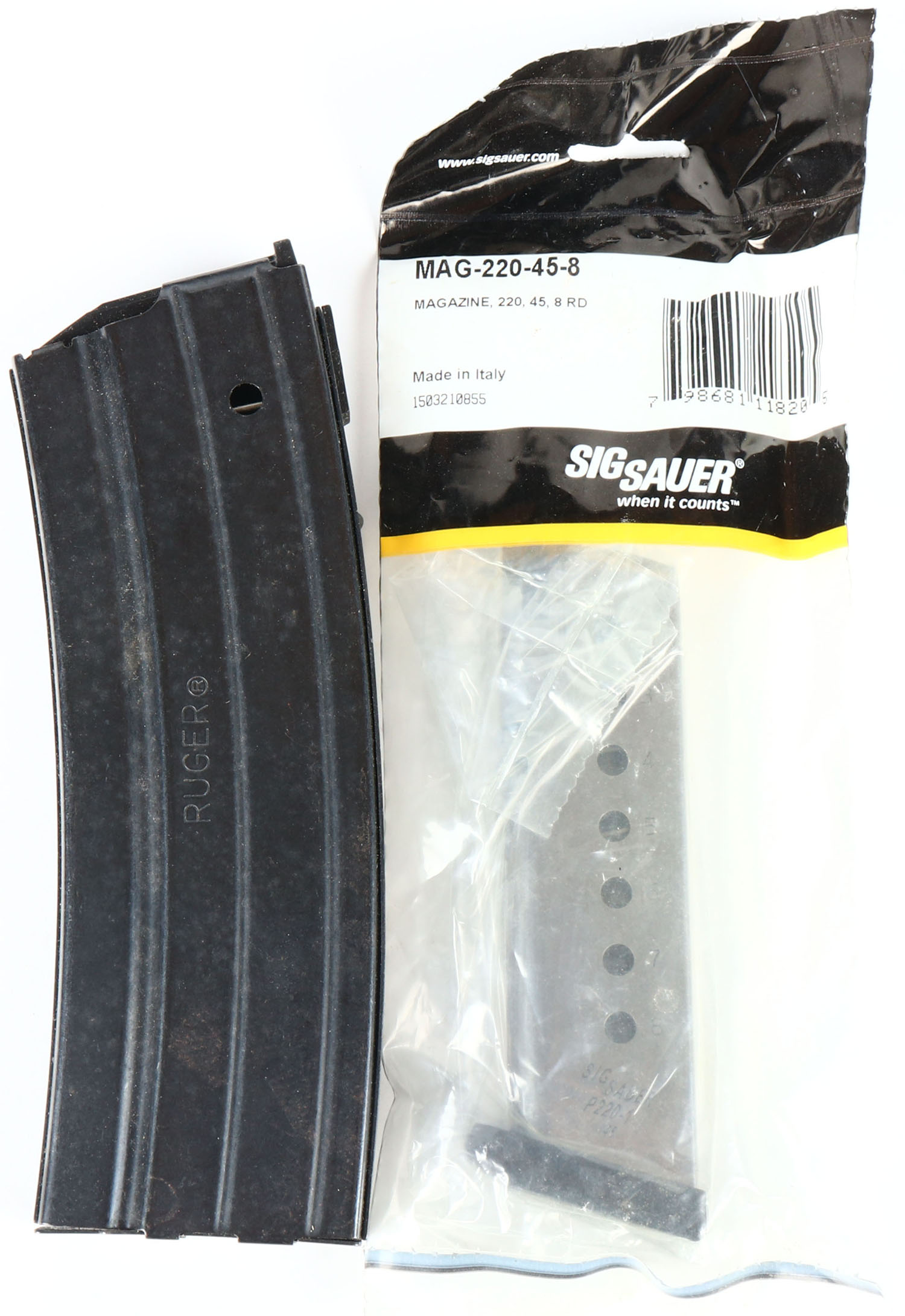 Lot of 2 mags, Sig sauer 220 45 cal 8 rd mag and Ruger rifle mini 14 mag. Grade: Excellent - Value: 30 to 90