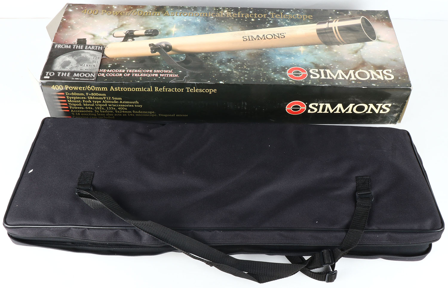 NEW Simmons 400 power/60mm Astronomical Refractor telescope, Model 800445, has orignal box, with instructions and orignal sale receipt from 2004, still sealed in interior box. Grade: Excellent ++ - Value: 20 to 50