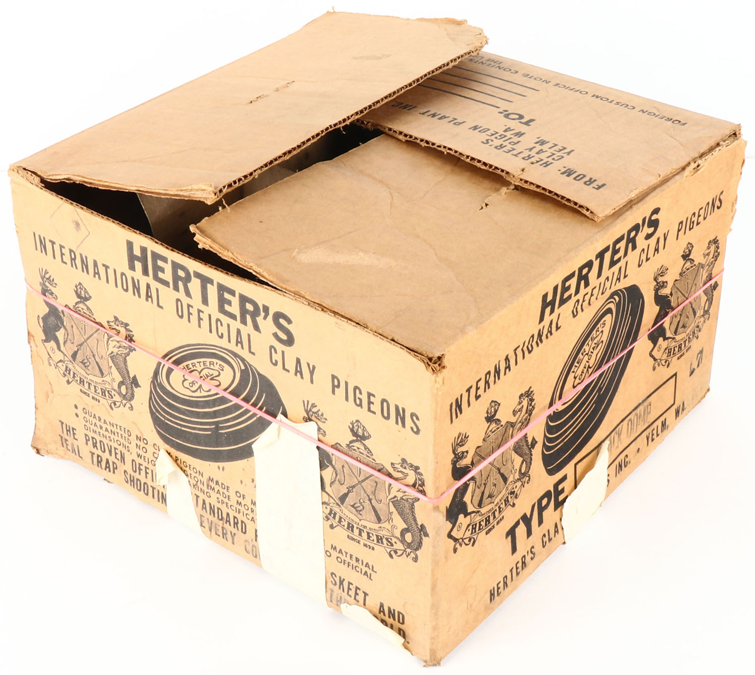 Case of Herters clay pigeosn, about half Full, all intact. Grade: Excellent - Value: 10 to 100