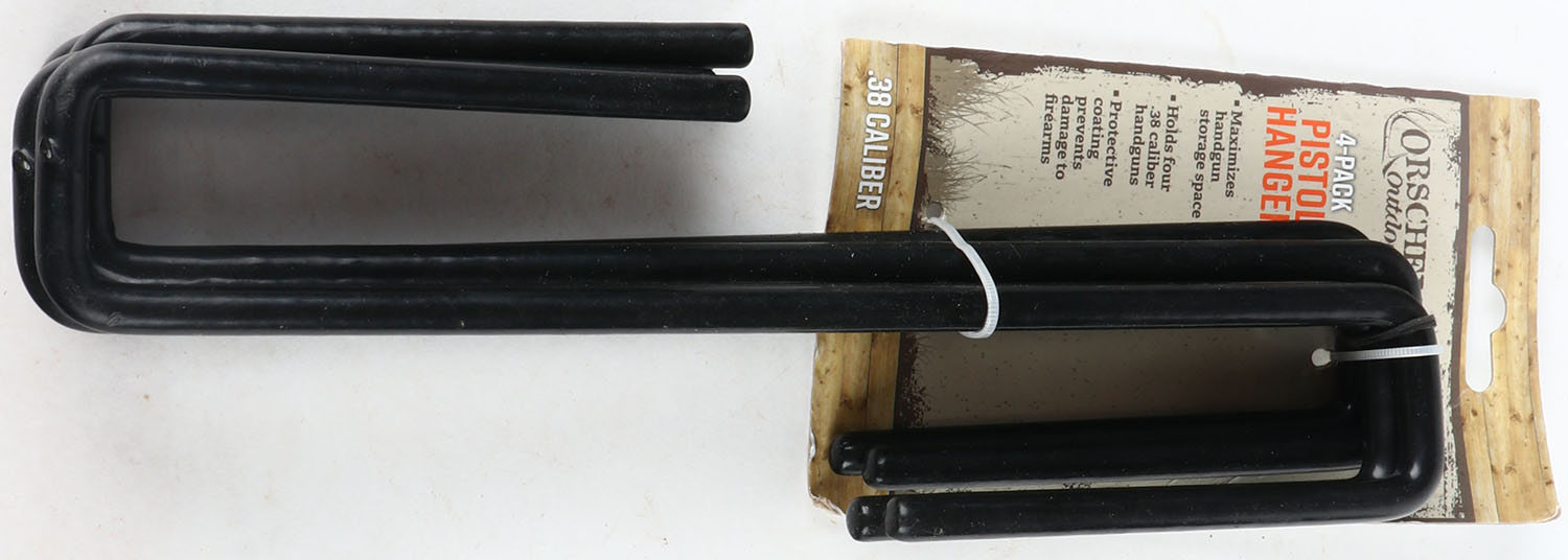 Orscheln 4 pack pistol hanger, .38 cal, or larger. these hook onto your shelf in your gun safe or book shelf so you can hang your pistol on the lower rod by sliding your barrel over the protected rod, helps keep your pistols organized & adds room for storage. Grade: Excellent ++ - Value: 10 to 20