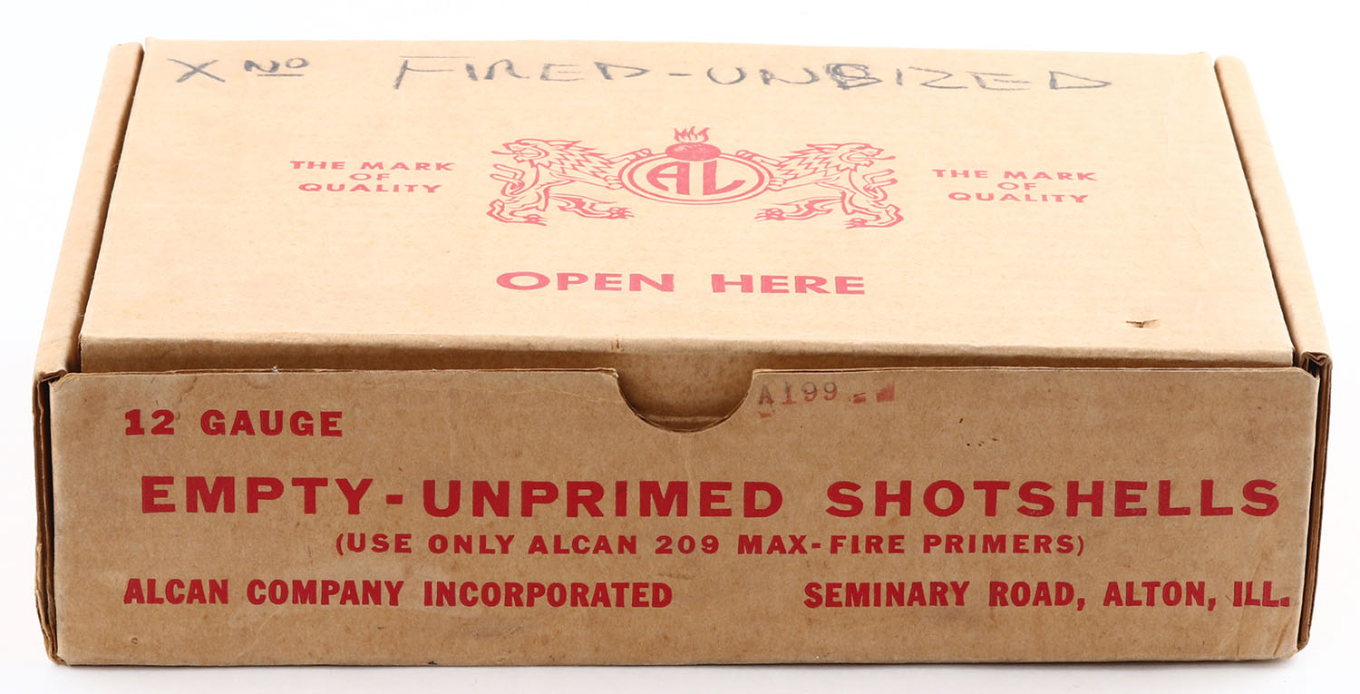 ALCAN 100ct. Box with Insert, 12ga., Empty Shotshells Unprimed, Possibly Fired, Full, buff box with red print, box is solid with writing to top, Shells are good. Grade: Excellent - Value: 30 to 100