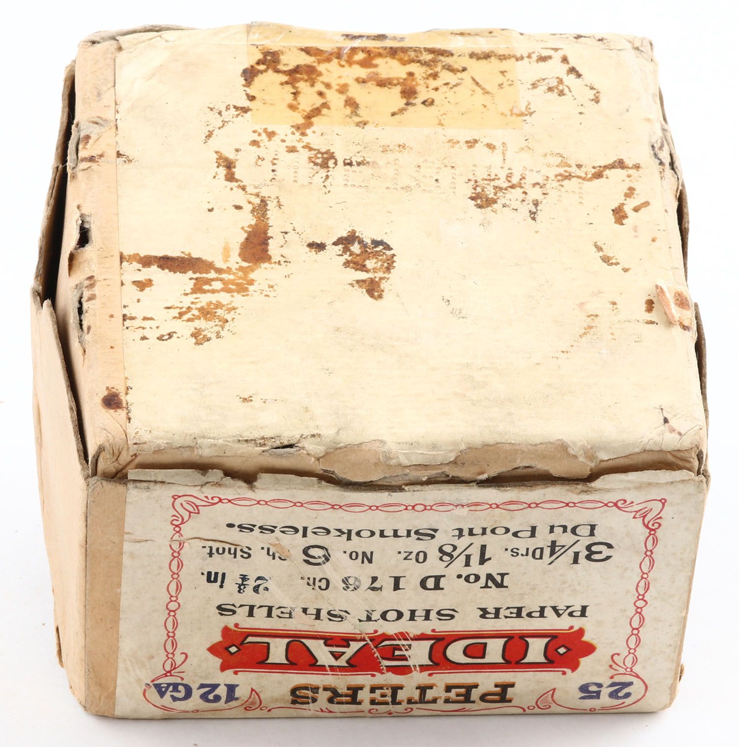 RARE Peters Cart., IDEAL SHELLS, 12ga., 2 3/4'', 2pc., Full with 24rds being correct shot, Loading: 3 1/4 Drs., 1 1/8 Oz., No. 6ch shot, buff box with multi colored label, box has seam splits with shell protrusion, has age soiling with tape repair to bottom, label is about 80% intact, paper shells are excellent. Grade: Very Good - Value: 150 to 800