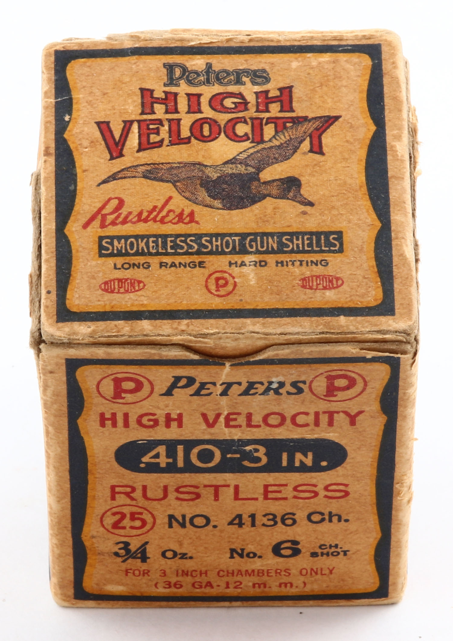 Peters Cart., High Velocity, 410ga., 3'', 1pc., Partial 18rds, shot size 6 CH, multi colored box that pictures mallard flying out of the marsh grass, No Duvrock sides, box has scuffing with edge wear, inside folding flaps are torn, has a seam split to top flap, paper shells are excellent, VERY RARE! Grade: Very Good - Value: 200 to 600