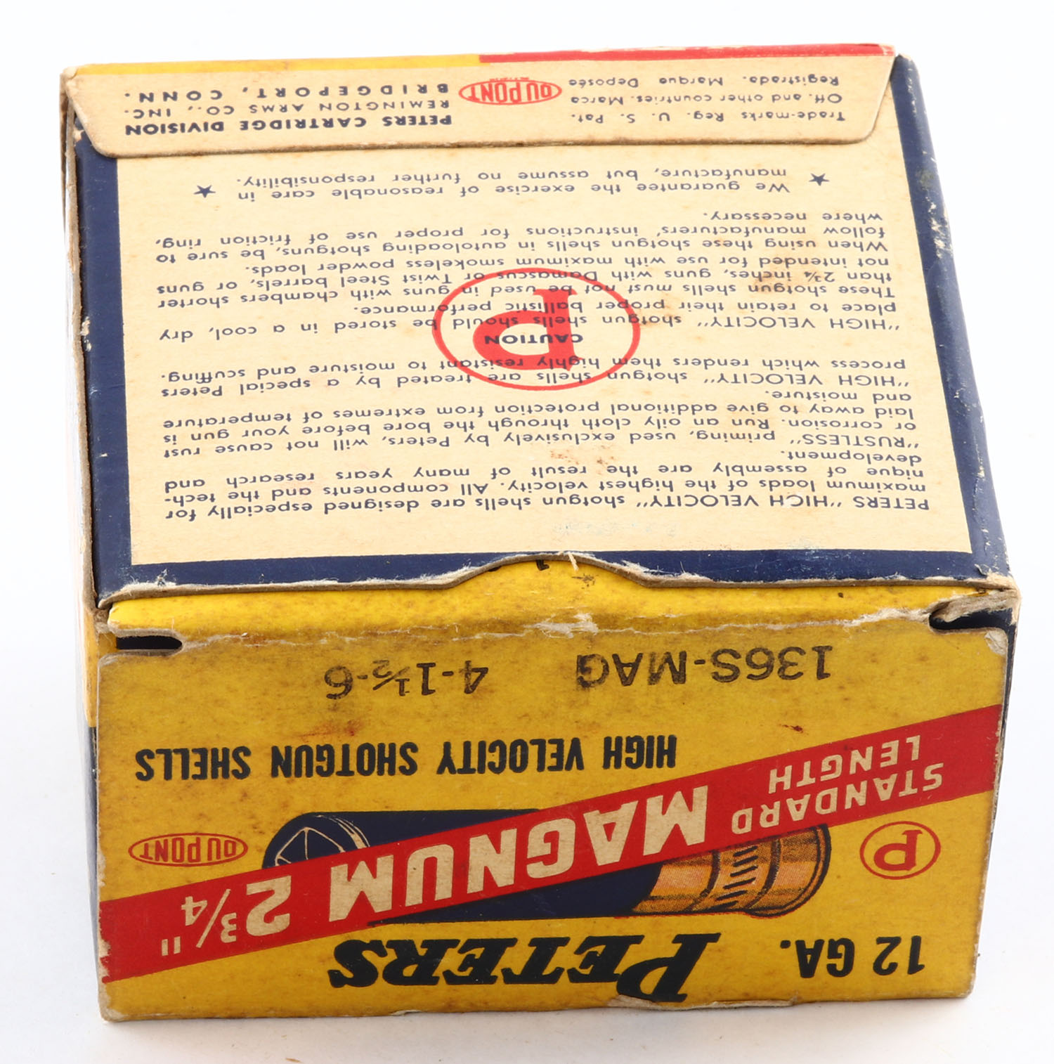 Peters Cart. Co., Standard-Length Magnum, High Velocity, New Peters Crimp, 12ga., 1pc., Full with 21rds being correct shot, shot size 6 Magnum, multi colored box that pictures mallard flying out of the marsh grass, box is solid with light edge wear & minor scuffing, paper shells are excellent. Grade: Excellent - Value: 60 to 140
