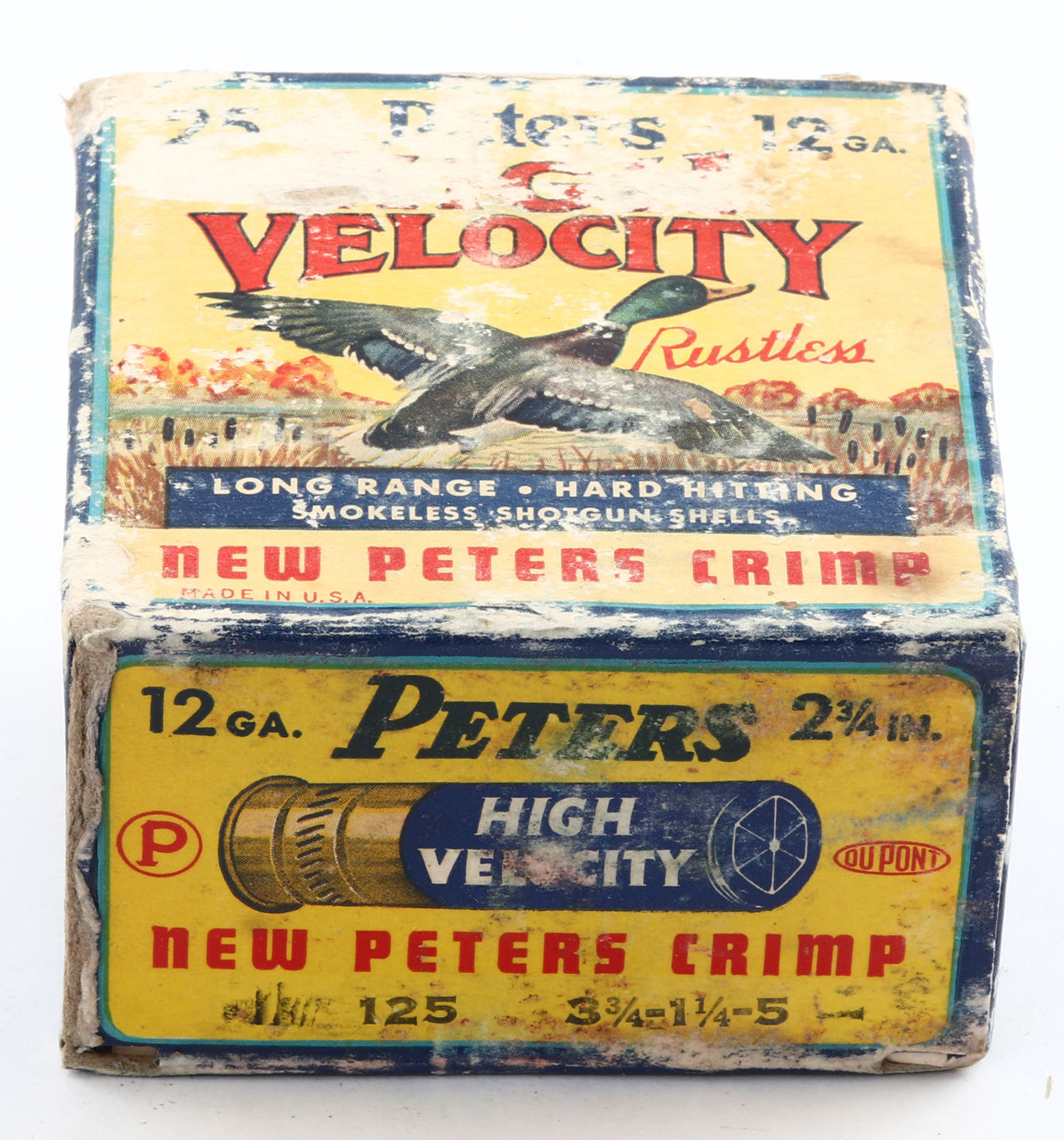 Peters Cart. Div., High Velocity, New Peters Crimp, 12ga., 2 3/4'', 1pc., Full, shot size 5, multi colored box that pictures mallard flying out of the marsh grass, box has scuffing & edge wear, paper shells are excellent. Grade: Good ++ - Value: 20 to 60