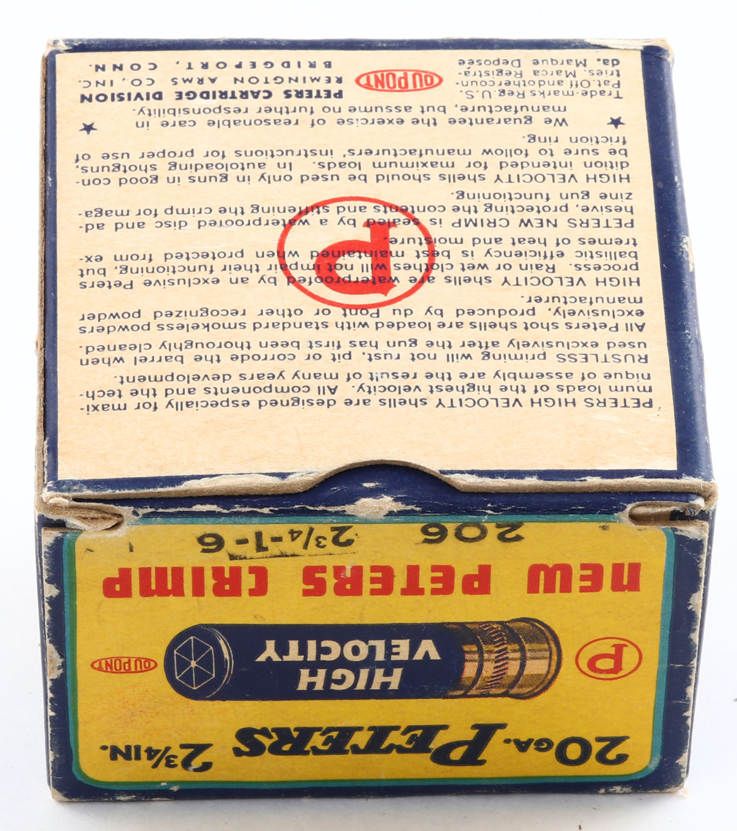 Peters Cart. Co., High Velocity, New Peters Crimp, 20ga., 1pc., Full, shot size 6, 2 3/4'', multi colored box that pictures mallard flying out of the marsh grass, box is solid with edge & corner wear, paper shells are excellent. Grade: Very Good ++ - Value: 20 to 60