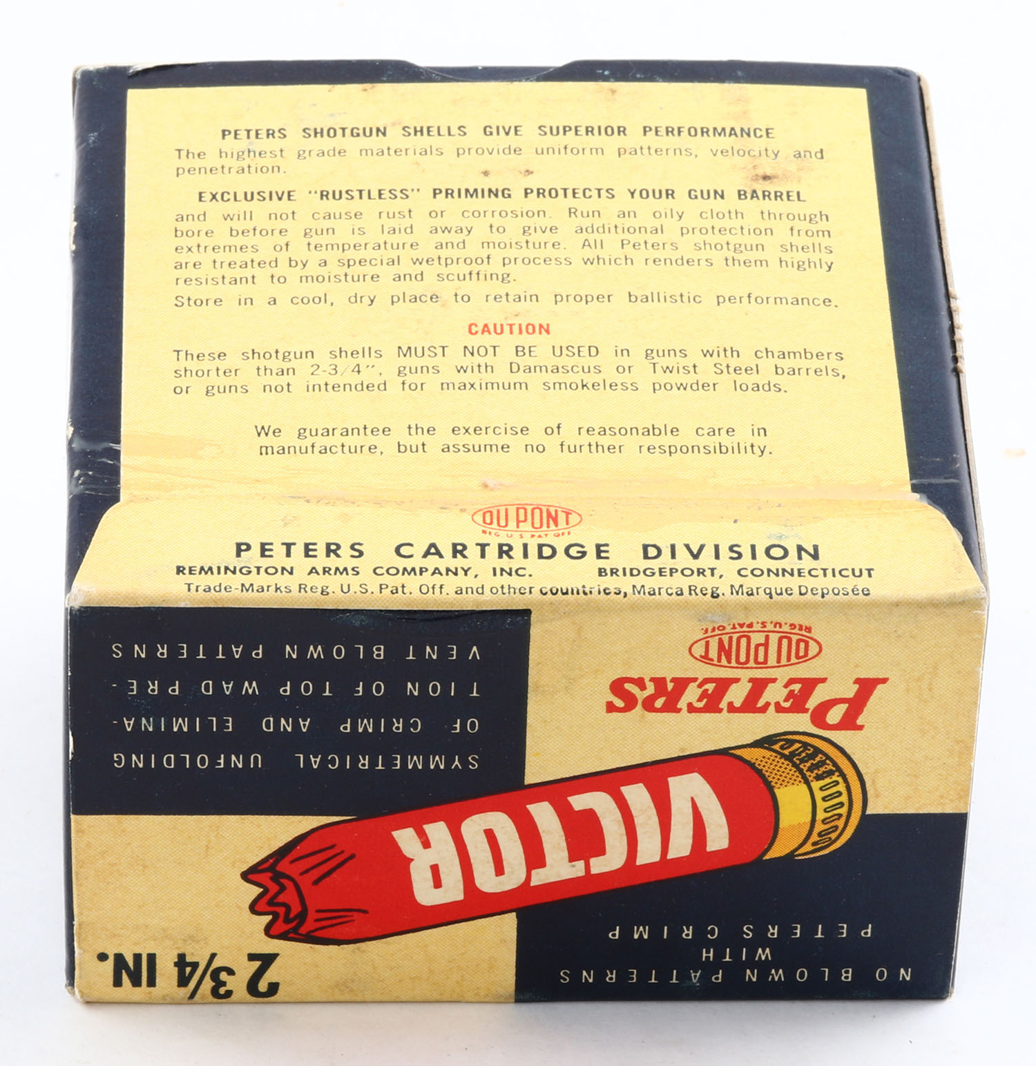 Peters, VICTOR Field Loads, 12ga., 1pc., Full, shot size 5, blue, yellow & red box, box is very solid with excellent colors, paper shells are excellent. Grade: Excellent ++ - Value: 20 to 60