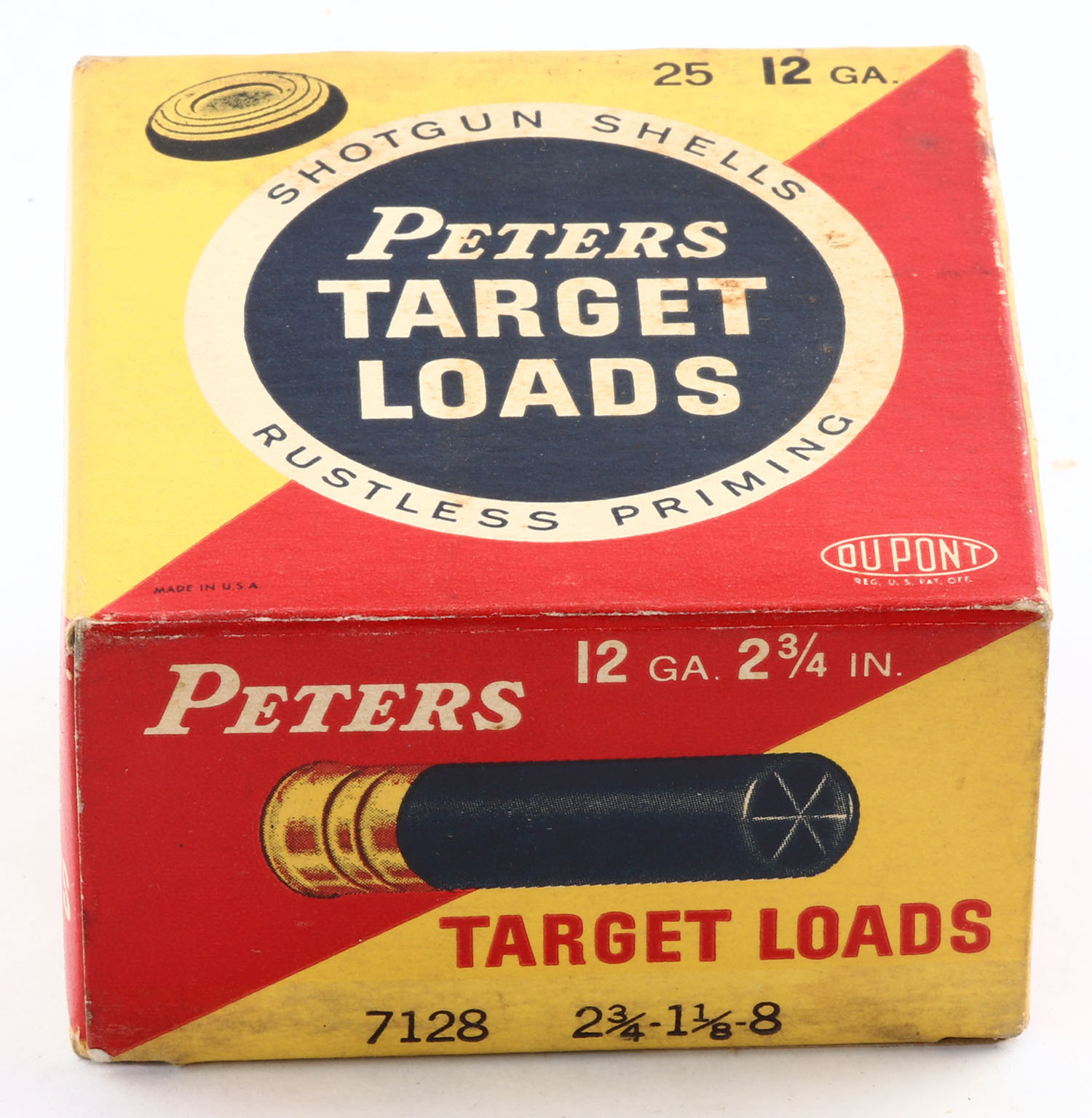 Peters, TARGET LOADS, 12ga., 1pc., Full, shot size 8, red, blue & yellow box, box has minor scuffing with excellent colors, paper shells are excellent. Grade: Excellent - Value: 10 to 30