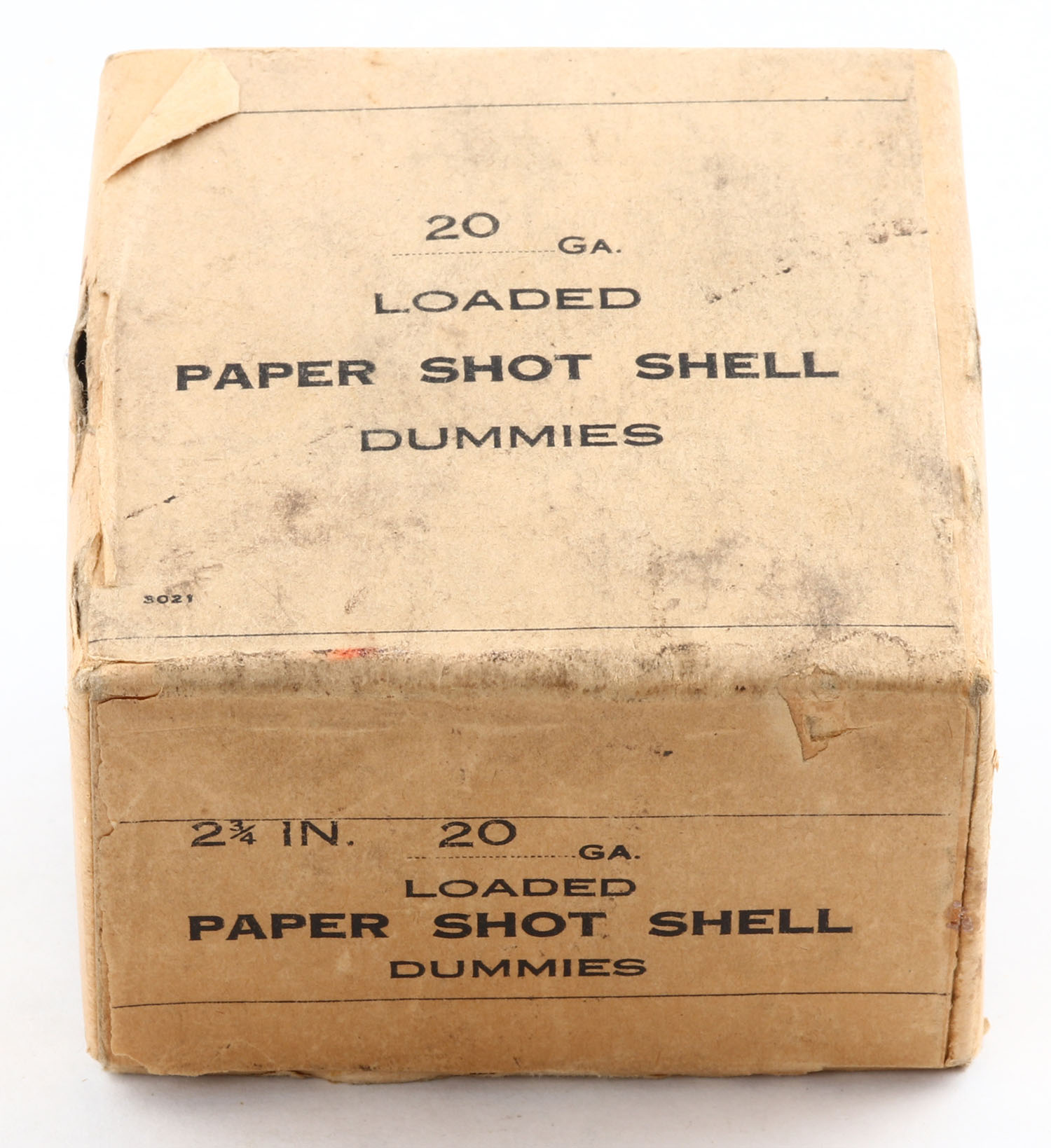 Winchester, Ranger, Loaded Paper Shot Shell Dummies, 20ga., 2pc., 2 3/4'', Full, Dummy Load, buff box with buff & black label, box has edge wear & scuffing with very minor shell protrusion, paper shells are excellent. Grade: Very Good ++ - Value: 60 to 200