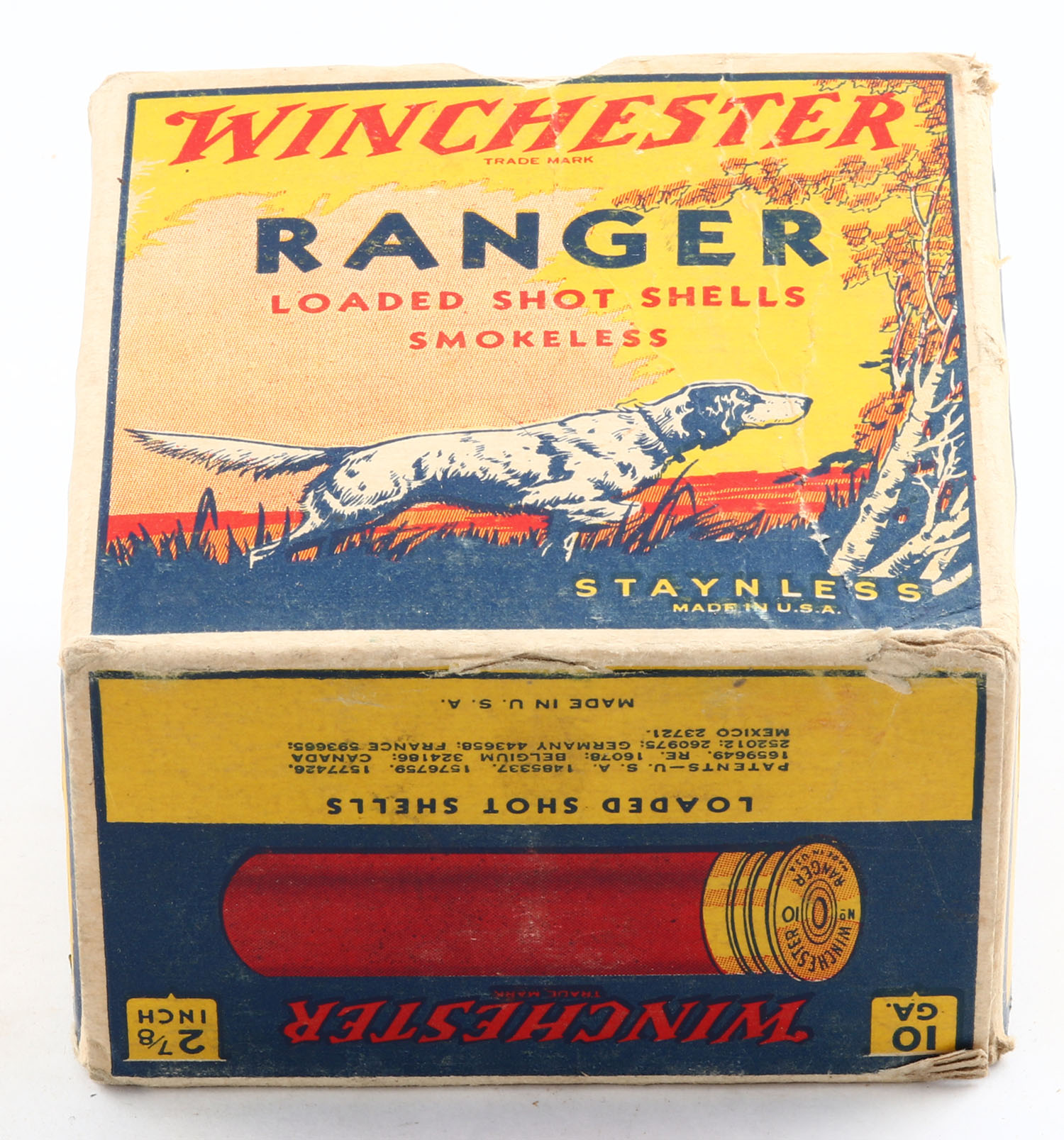 Winchester, Ranger, 10ga, 1pc., Partial 22rds, Shot Size 6, 2 7/8'', multi colored box, dog on point, box has edge wear with a partial seam split, has scuffing with very nice colors, paper shells are excellent. Grade: Very Good + - Value: 30 to 90
