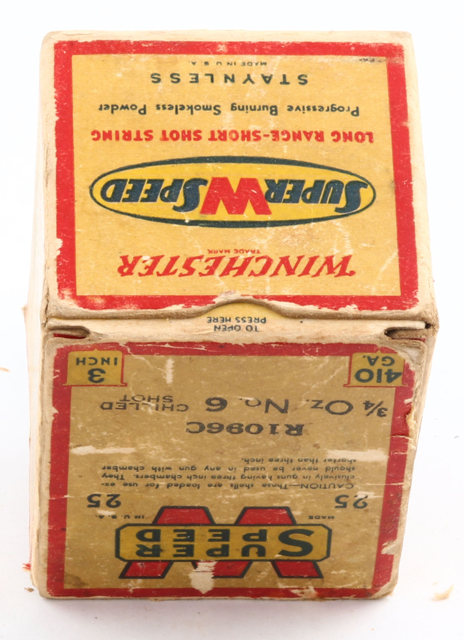 Winchester, Super W Speed, 410ga., Staynless, 3'', 1pc., Full, shot size 6CH, cream, red, blue and yellow box, box has age soiling & edge wear, paper shells are excellent. Grade: Very Good + - Value: 20 to 60