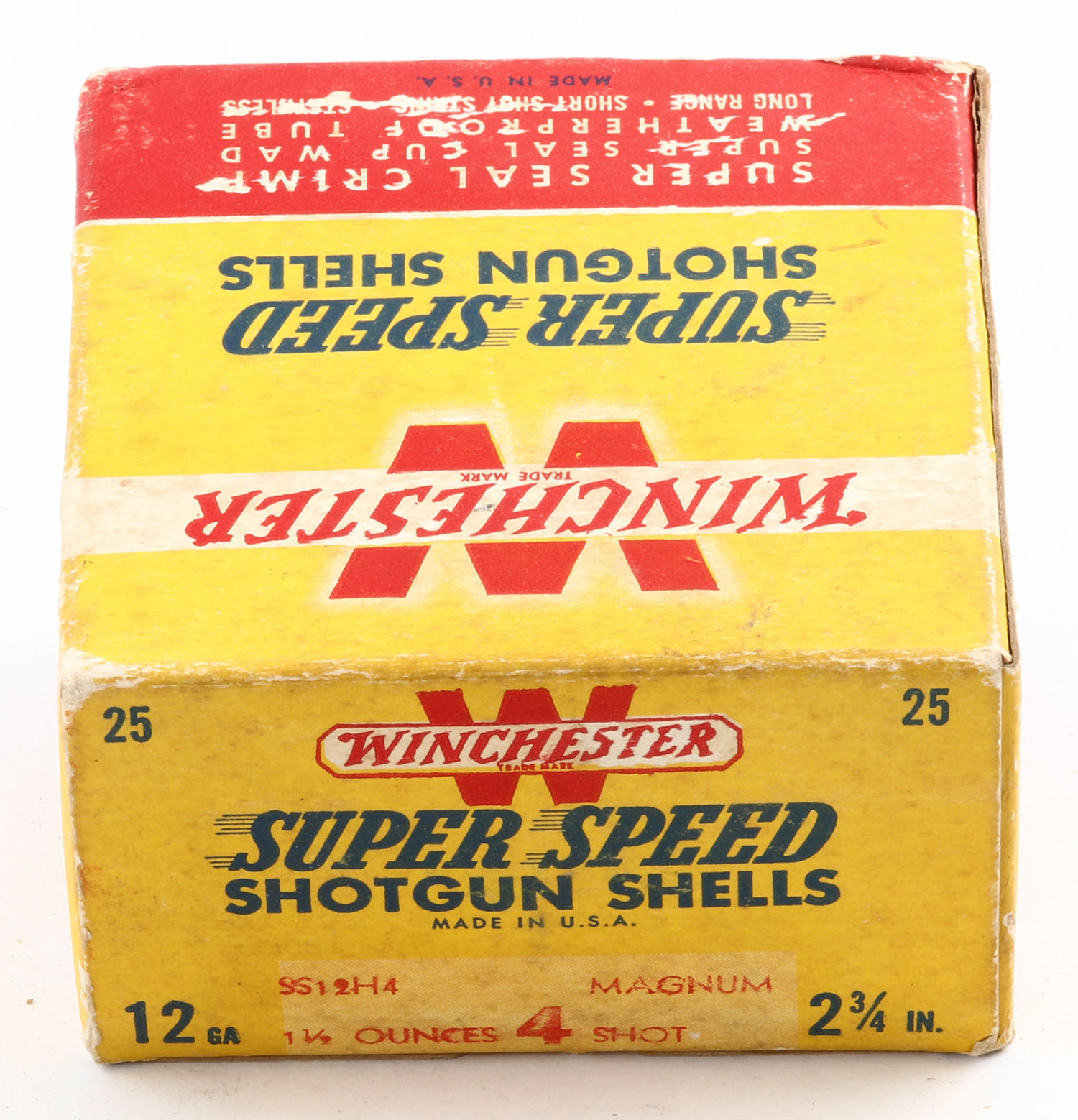 Winchester, Super Speed with Insert, 12ga., 2 3/4'', 1pc., Full, shot size 4 Magnum, red, black and yellow box, box has edge wear with scuffing, paper shells are excellent. Grade: Very Good ++ - Value: 10 to 40