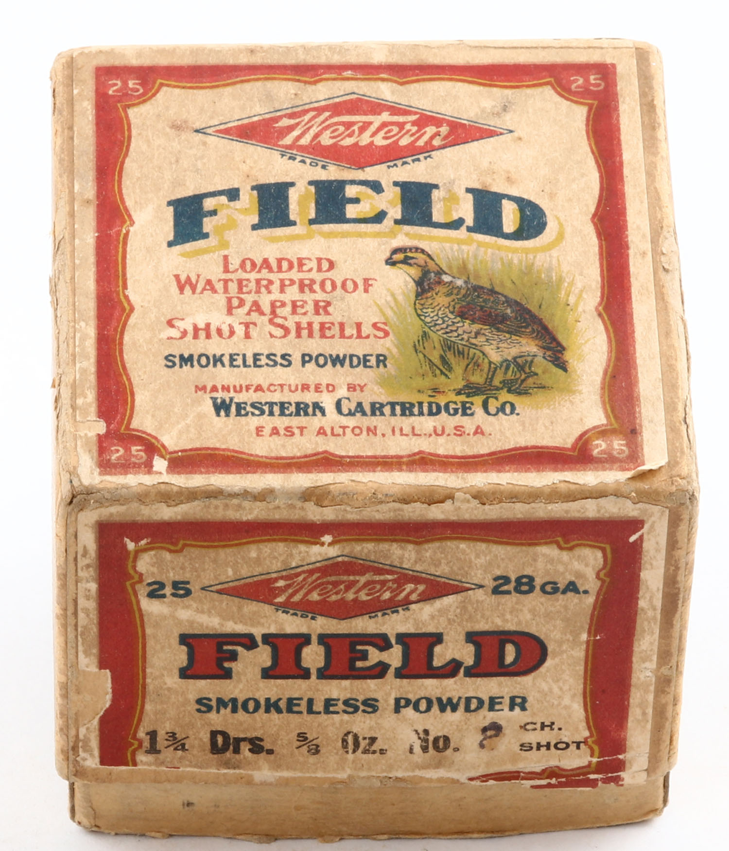 Early Western, Field, 28ga., 2pc, Full, shot size 8 CH, box has light age soiling with some scuffing & edge wear, paper shells are very good. Grade: Very Good ++ - Value: 100 to 500