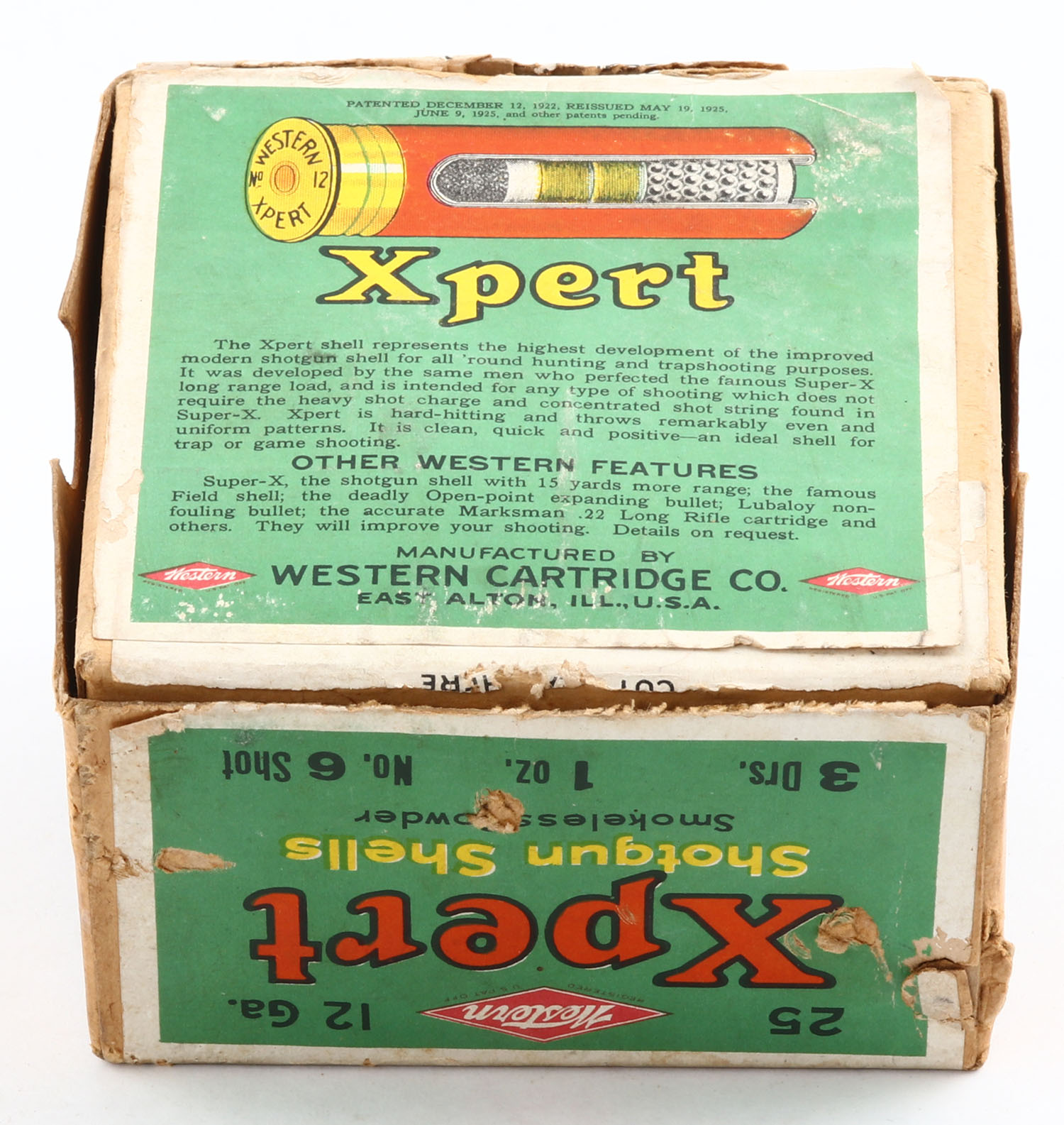 Western, Xpert, 12ga., 2pc., Empty, shot size 6, 3 Drs. 1 Oz., buff box with green, red & black label, box shows dog on point, box has scuffing with light age soiling & edge wear, label has a partial tear to side, Western Diamond Logo on one side. Grade: Very Good + - Value: 300 to 600