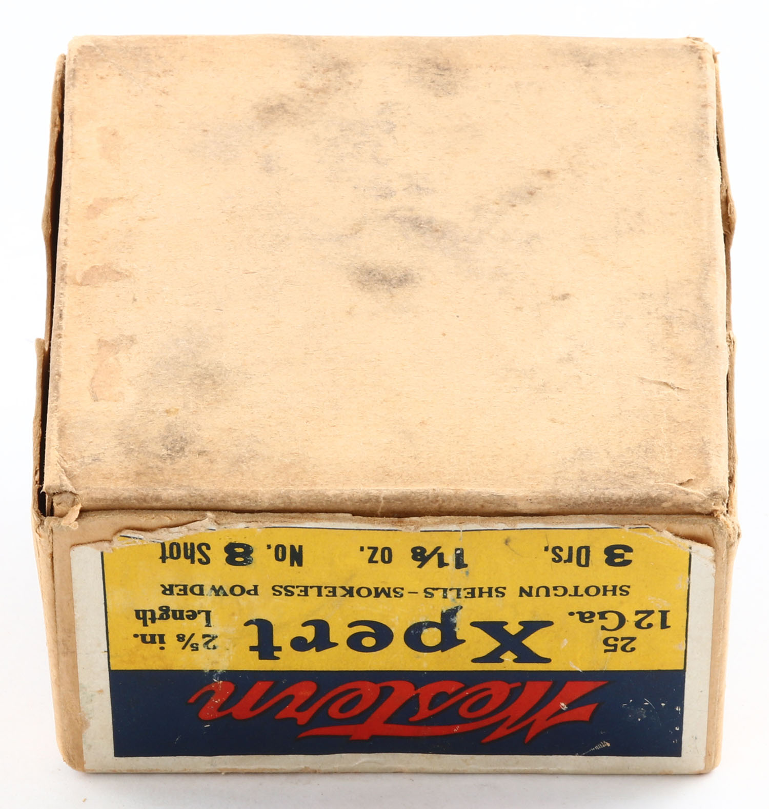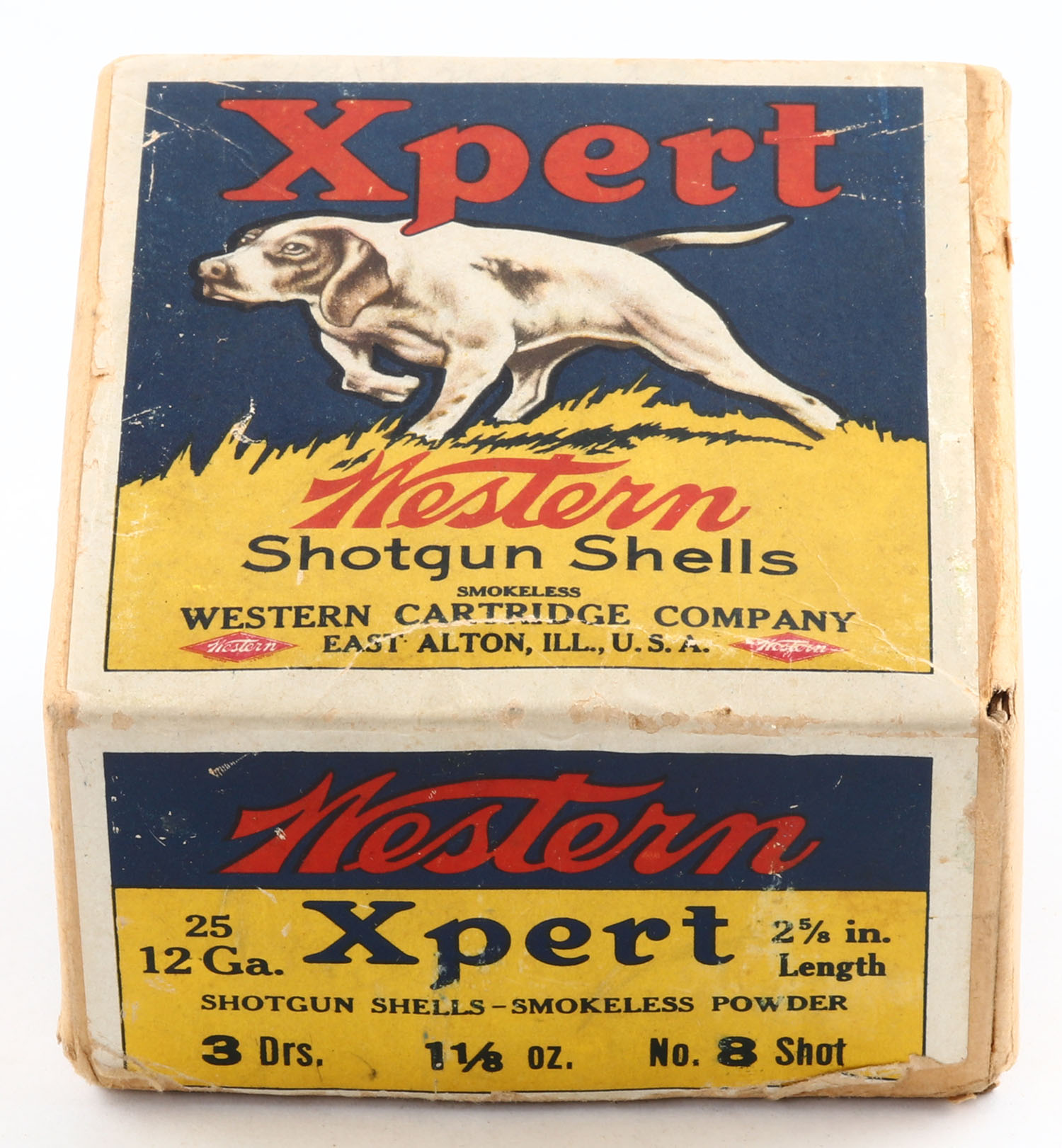 Western, Xpert, 12ga., 2 5/8'', 2pc., Empty, Shot size 8, blue, yellow & red box with a dog on point, box has scuffing with light edge wear, bottom has no label. Grade: Excellent - Value: 40 to 100
