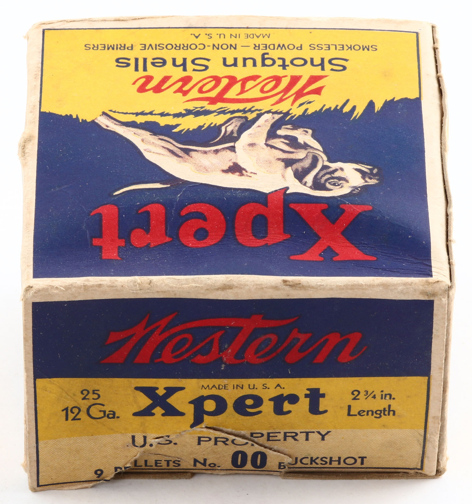 Western, Xpert, U.S. PROPERTY, 12ga., 2 3/4'', 1pc., Full, blue, yellow & red box with a dog on point, Loading: U.S. PROPERTY 9 Pellets No. 00 BUCKSHOT, box has a tear to top flap, has light shell protrusion with some shelf wear, paper shells are excellent. Grade: Very Good + - Value: 50 to 200