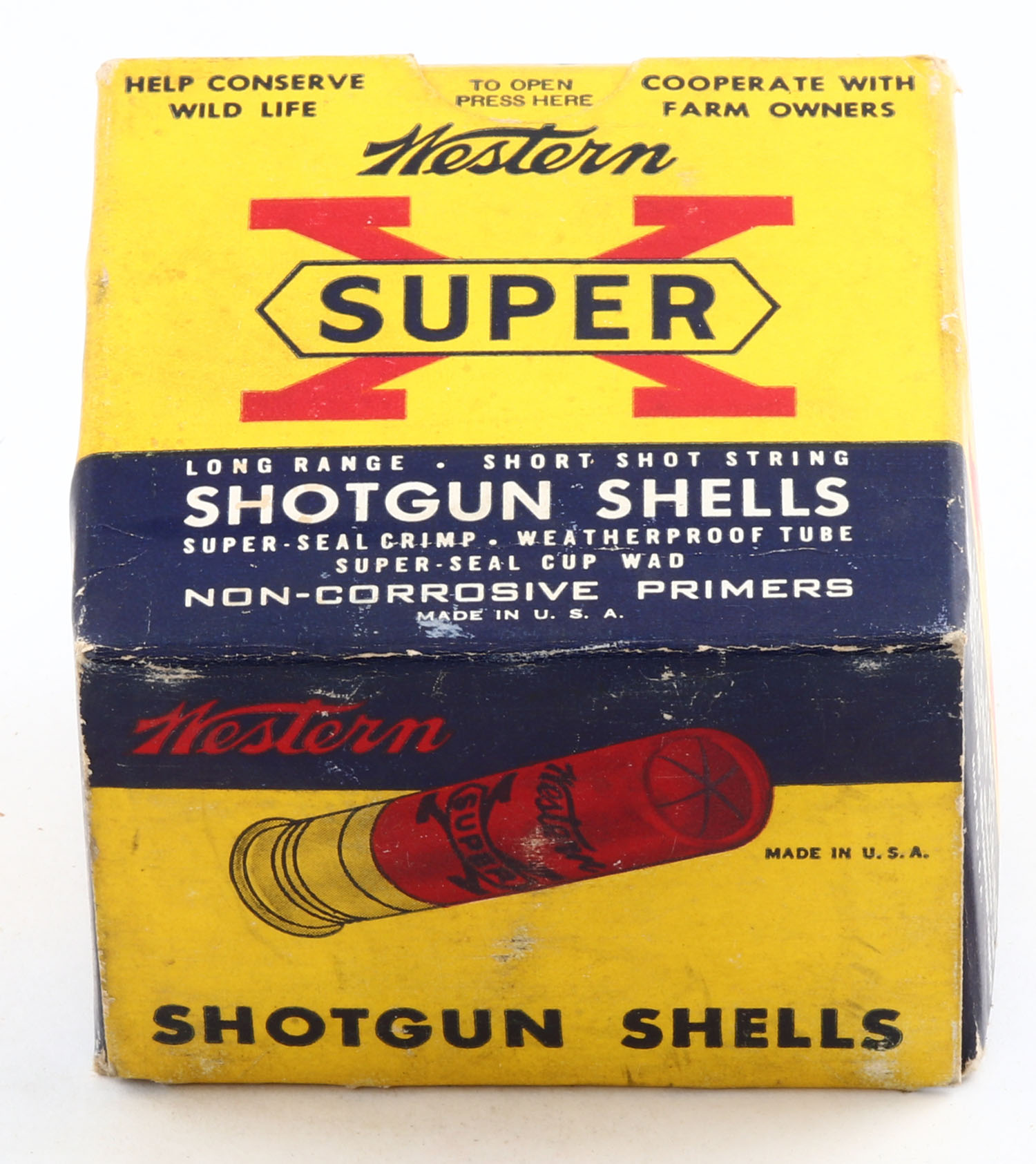 Western, Super X, 20ga., 2 3/4'', 1pc., Full, shot size 6, multi-colored box, box has seam split with some scuffing, paper shells are excellent. Grade: Very Good ++ - Value: 10 to 30