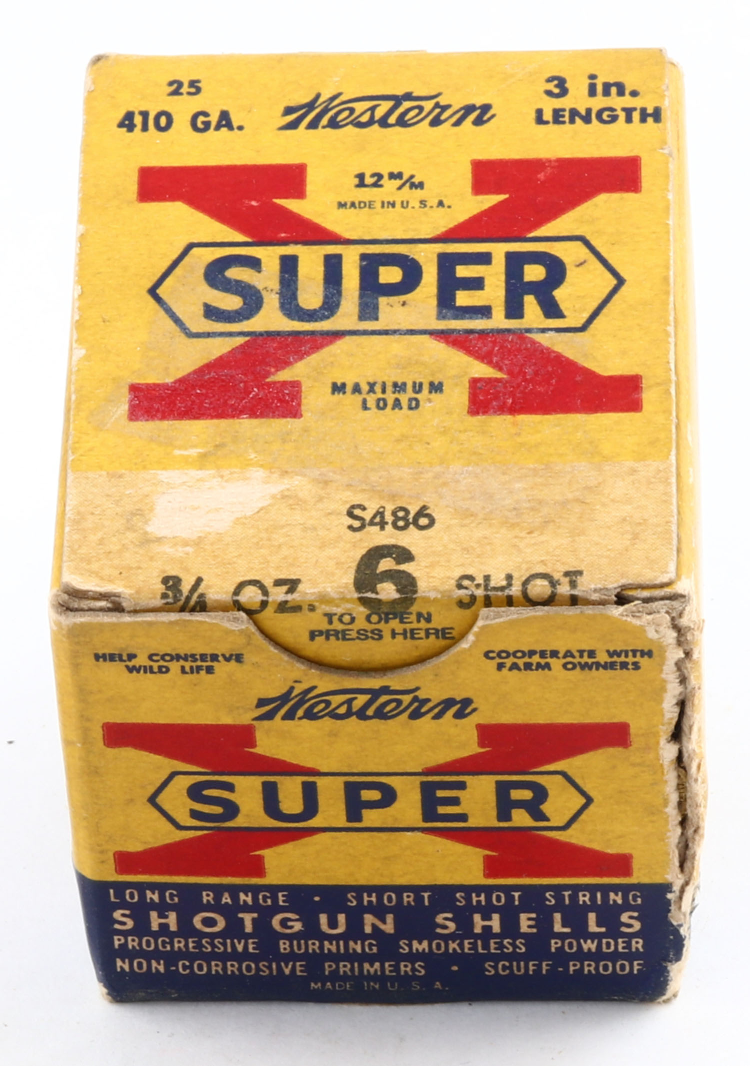 Western, Super X, 410ga., 3'', 1pc., Full, shot size 6, multi-colored box, box has a seam split with some age soiling, paper shells are excellent. Grade: Very Good + - Value: 10 to 30