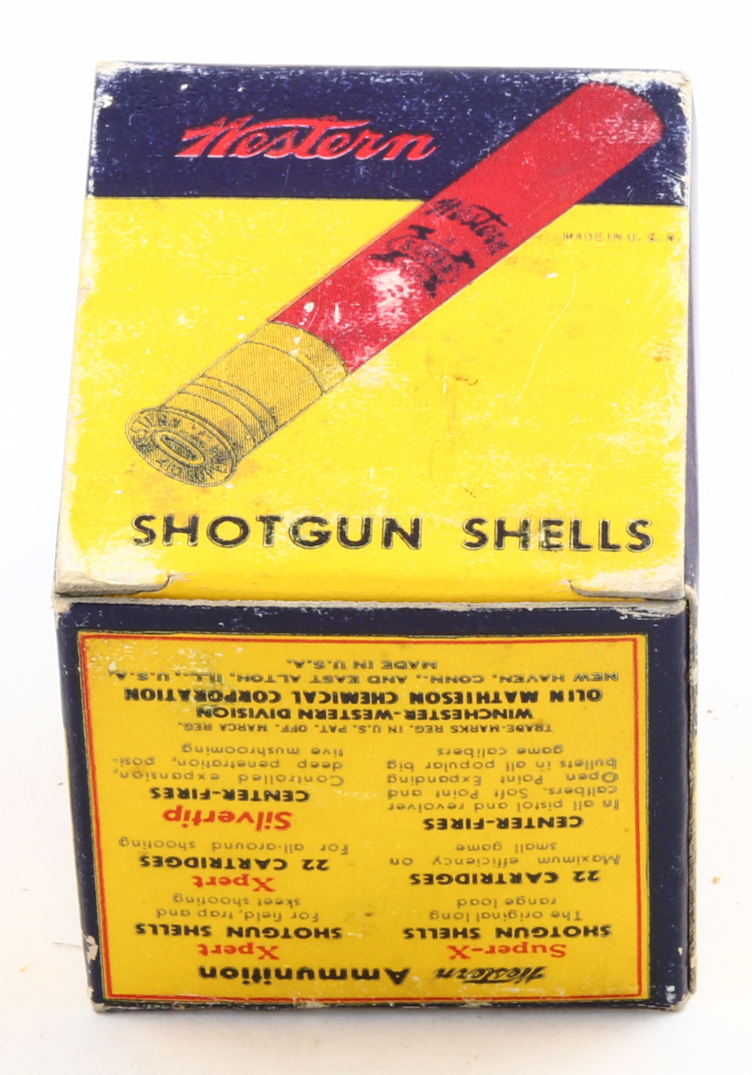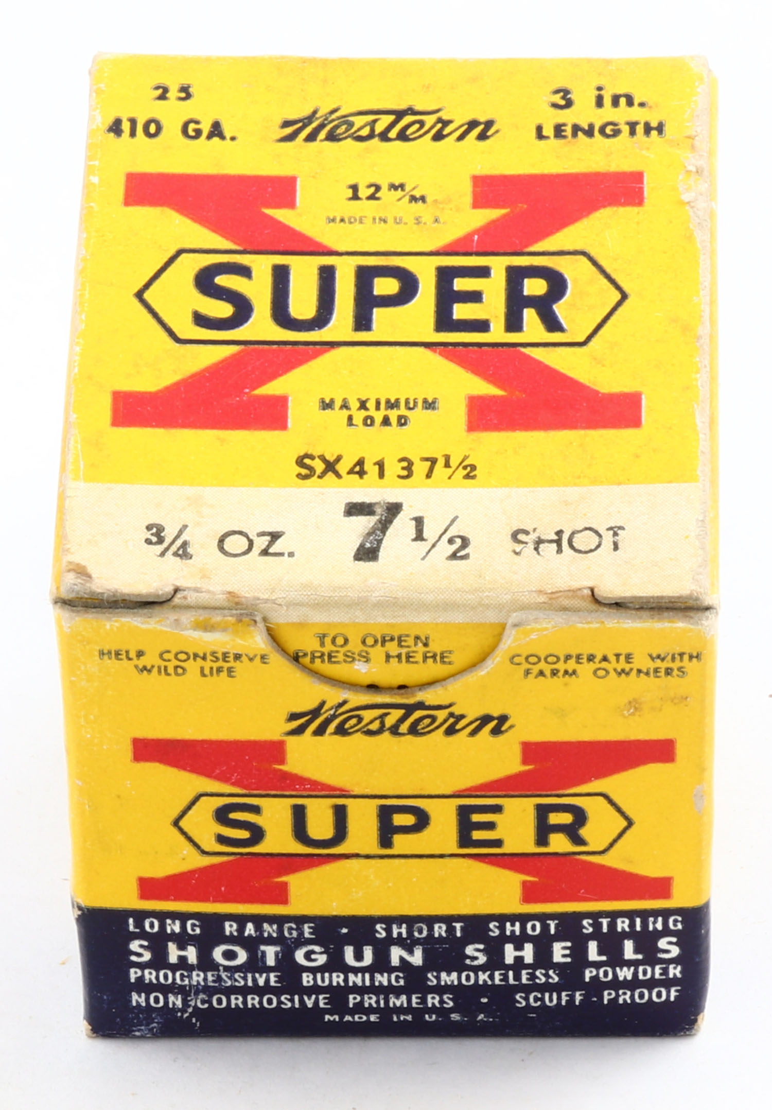 Western, Super X, 410ga., 3'', 1pc., Full, shot size 7 1/2, multi-colored box, box has some scuffing with light edge wear, paper shells are excellent. Grade: Very Good - Value: 10 to 30