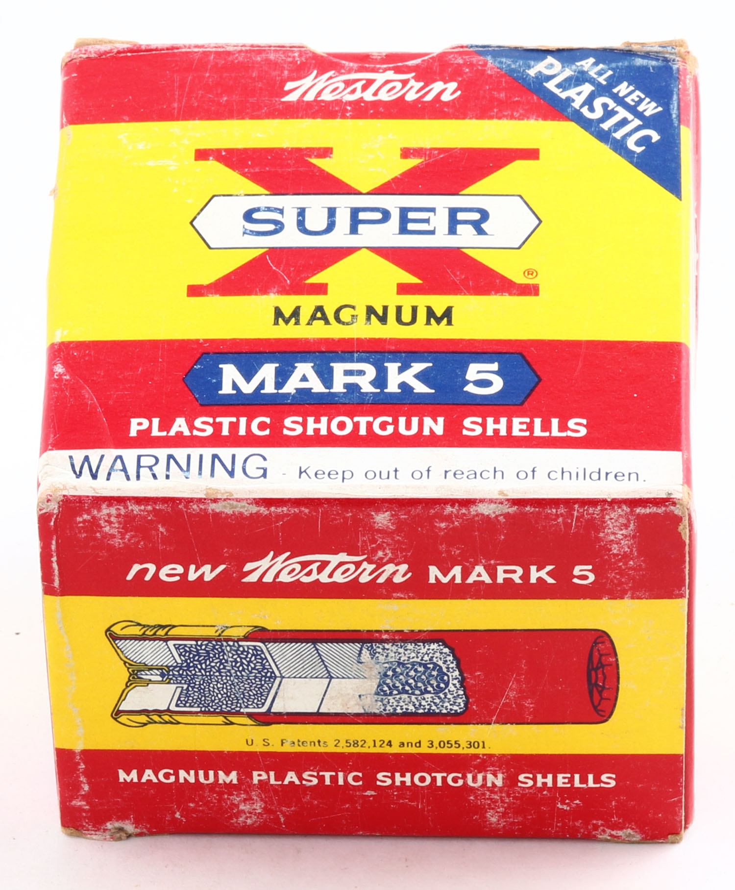 Western, Super X, Mark 5, 20ga., 3'', 1pc., Full, shot size 4 Magnum, multi-colored box, box is solid with light scuffing, plastic shells are excellent. Grade: Very Good ++ - Value: 10 to 30