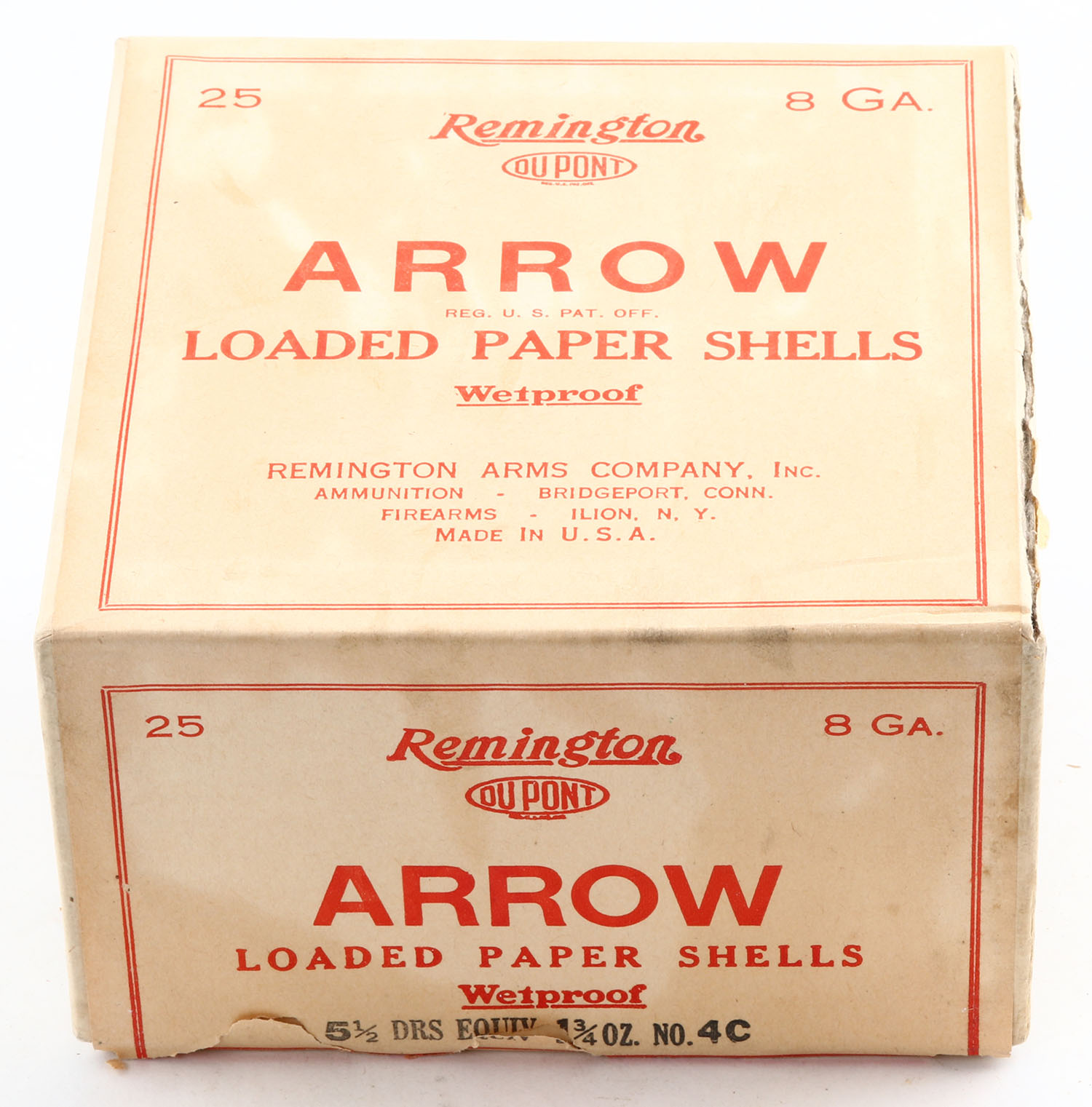 Remington, ARROW, 8ga., 2pc., Full, shot size 4C, 5 1/2 DRS., 1 3/4 Oz., buff box with buff & red label, box & label are very nice, box has one seam split, Shells are excellent. Grade: Very Good ++ - Value: 100 to 800