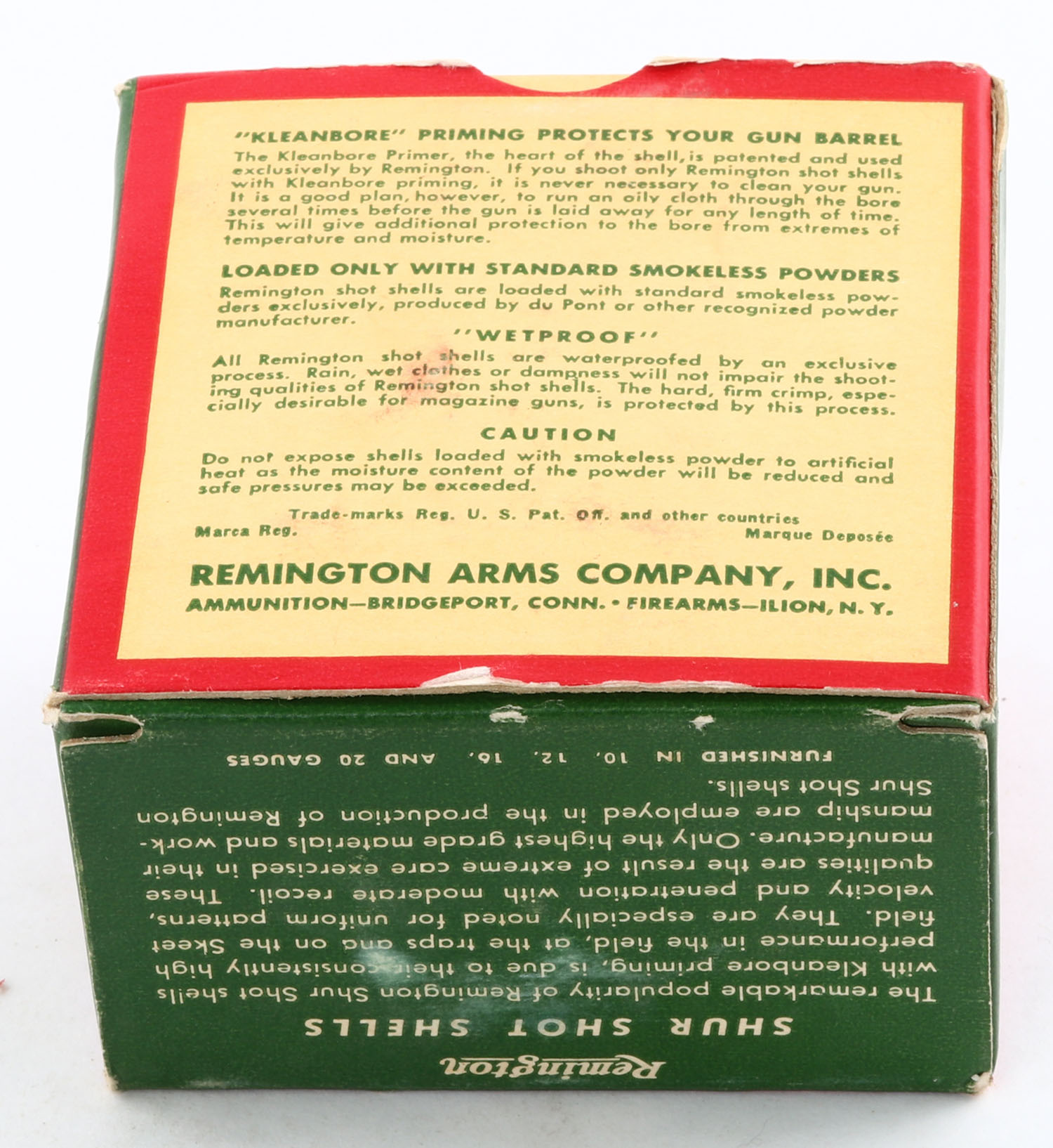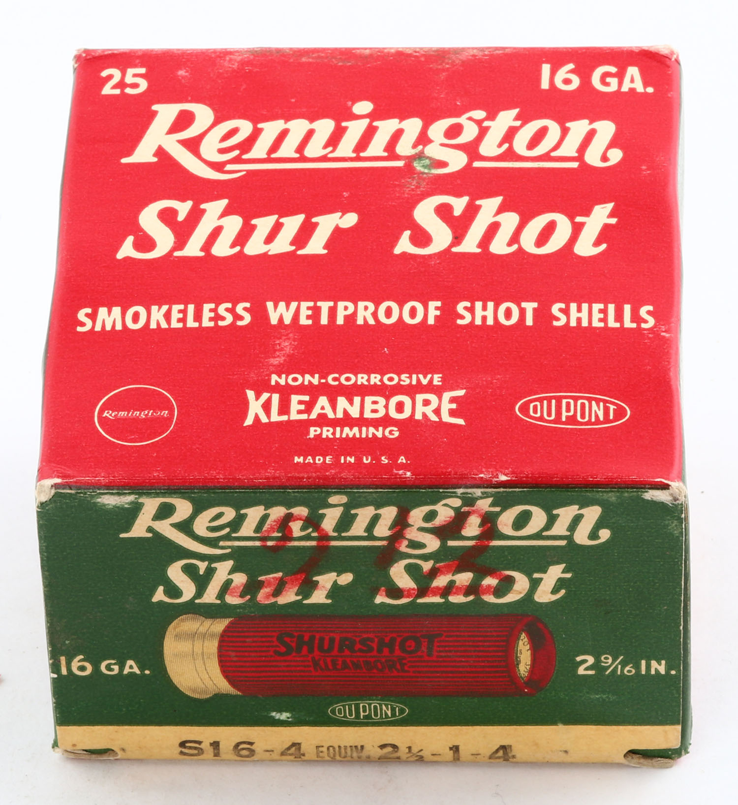 Remington Shur Shot, 16ga., 2 9/16'', 1pc., Full, shot size 4, box is white, yellow, red and green, box has light scuffing, paper shells are excellent. Grade: Excellent + - Value: 10 to 40