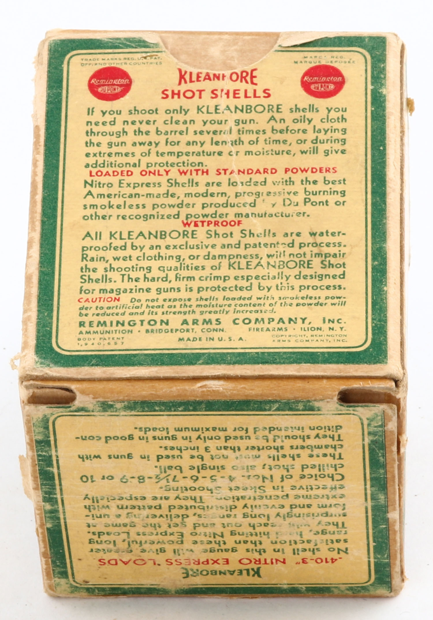 Remington Kleanbore, NITRO EXPRESS, 410ga., 3'', 1pc., Partial 19rds., shot size 6 C, box is yellow, red and green, box has light edge wear with scuffing, paper shells are excellent. Grade: Very Good - Value: 20 to 50